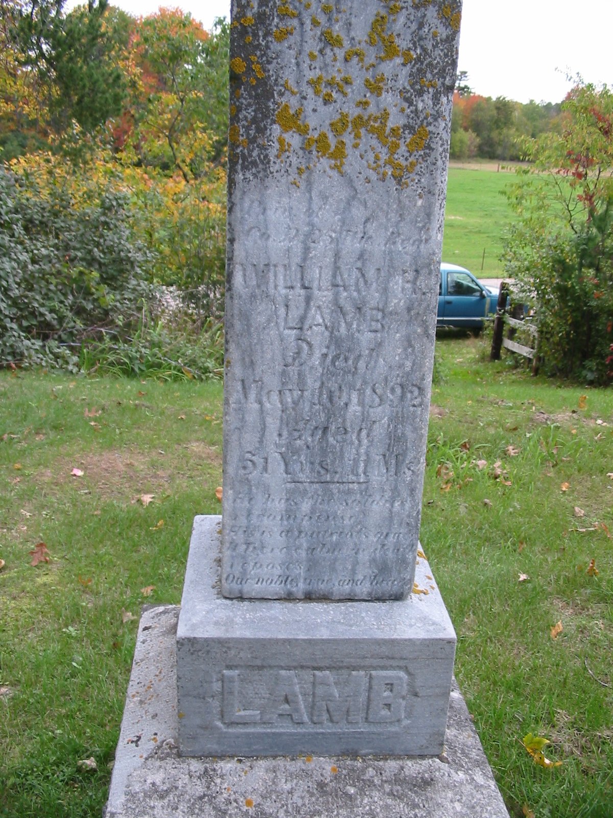29. Lucy D. BOYNTON was born in December 1846 in Pennsylvania.28,31,43 She appeared in the census in 1900 in Greenfield Township, Monroe County, WI.28 She appeared in the census in 1930 in Greenfield Township, Monroe County, WI.40 She was living with her son Artemus. Lucy died in 1936 at the age of 90.43 She was buried in La Grange Township, Monroe County, WI.43 in the Boynton Family Cemetery. Lucy D. BOYNTON and William Henderson LAMB Sr. were married on 14 February 1866 in Lincoln Township, Monroe County, WI.20,27 (Her surname is listed as "Boyington" in the Marriage Registration Records, but it is believed to have been "Boynton" because she was buried with members of her family in the Boynton Family Cemetery.) William Henderson LAMB Sr., son of Alexander Hannibal LAMB and Malinda E. ENCHES, was born in 1842 in Pennsylvania.11,43 He appeared in the census in 1860 in Greenfield Township, Monroe County, WI.11 About 1880 he was a farmer in Angelo Township, Monroe County, WI.10 William died in 1893 at the age of 51.43 He was buried in La Grange Township, Monroe County, WI.43 in the Boynton Family Cemetery. CENSUS1850: States he was born in PA. Lucy D. BOYNTON and William Henderson LAMB Sr. had the following children: +65 | i. | Alpharata LAMB. | +66 | ii. | Alvin "Milo" LAMB. | +67 | iii. | William LAMB Jr.. | 68 | iv. | Artemus A. LAMB was born in 1879 in Wisconsin.10,16,43 (His given name was spelled "Artimus" on his gravestone.) She appeared in the census in 1930 in Greenfield Township, Monroe County, WI.40 She died in 1946 at the age of 67.43 Artemus was buried in La Grange Township, Monroe County, WI.43 in the Boynton Family Cemetery. |