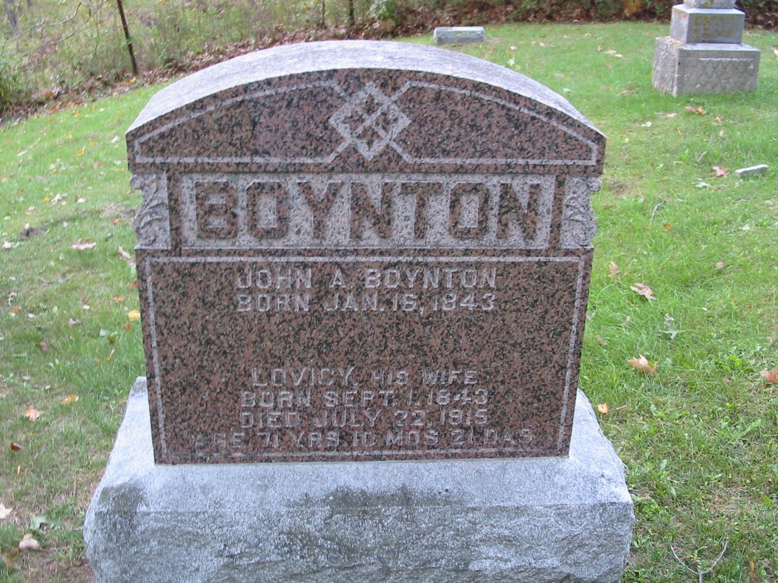 21. Lovicy "Lovisa" SHUTTER was born on 1 September 1843 in Middleburgh Township, Schoharie County, NY.2,12,14,16 (Her given name was listed as Lovicy on her gravestone.) She appeared in the census in 1850 in Broome Township, Schoharie County, NY.6 She appeared in the census in 1880 in La Grange Township, Monroe County, WI.10 Lovisa died on 22 July 1915 at the age of 71 in La Grange Township, Monroe County, WI.2,17 Obituary Notes: "Mrs. John Boynton, an old resident of the town of LaGrange, died (of face cancer) on Thrusday, July 22, aged 72 years. She was born in Middleburg, N.Y., September 1, 1843 and came west with her parents while she was a child. She lived in this vacinity until the time of her death. She is survived by her husband, their three children having passed on before. Funeral services were conducted at the home Sunday afternoon by Rev. L. E. Hoisington and the burial was in the family burial ground on the farm." She was buried in La Grange Township, Monroe County, WI.14 in the Boynton Family Cemetery. Lovicy "Lovisa" SHUTTER and John A. BOYNTON were married before 1866.14 (They were 1st cousins.) John A. BOYNTON, son of Reuben D. BOYNTON and Jane SHUTTER, was born on 15 January 1843 in Pennsylvania.11,14 He appeared in the census in 1880 in La Grange Township, Monroe County, WI.10 He died on 10 April 1925 at the age of 82 in Benton County, MN.17 John was buried in La Grange Township, Monroe County, WI.14 in the Boynton Family Cemetery. Lovicy "Lovisa" SHUTTER and John A. BOYNTON had the following children: 38 | i. | Ida BOYNTON was born on 19 May 1872 in Monroe County, WI.10,14 (Calculated birth date; she was 15 years, 1 month and 18 days old at the time her death. The 1880 Census listed her age as 14 years old.) In the 1880 Census, she was listed as "Idiotic." She appeared in the census in 1880 in La Grange Township, Monroe County, WI.10 She died on 6 July 1887 at the age of 15 in Monroe County, WI.14 Ida was buried in La Grange Township, Monroe County, WI.14 in the Boynton Family Cemetery. | 39 | ii. | Mary BOYNTON died in 1879 in Monroe County, WI.14 She was buried in La Grange Township, Monroe County, WI.14 in the Boynton Family Cemetery. | 40 | iii. | Harlie BOYNTON died on 18 August 1881.14 He was buried in La Grange Township, Monroe County, WI.14 in the Boynton Family Cemetery. |