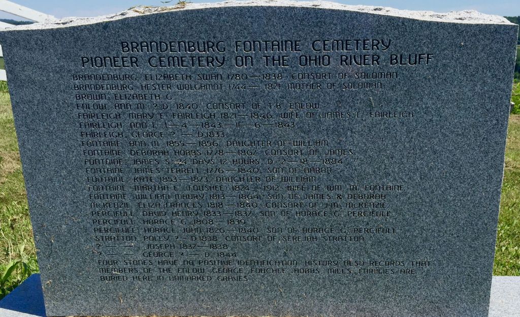 40. Joseph Henson BRANDENBURG Sr. (+) was born in 1767 in Hampshire County, West Virginia Colony, British Colonial America.6,9 He appeared in the census in 1850 in Owsley County, KY.4 He appeared in the census in 1860 in Owsley County, KY.4 Joseph died in 1864 at the age of 97 in Heidelberg, Lee County, KY.3,4,9 Life Sketch: "He and his wife moved to Clark County, KY and from thence to Owsley County, to the place now known as Heidelberg, KY. He died at his old home place at the age of 90 years, his wife having died about eight years previous." He was buried in Heidelberg, Lee County, KY.3 in the Brandenburg Fontaine Cemetery. Joseph Henson BRANDENBURG Sr. (+) and Delilah VESSER (+) were married on 19 September 1796 in Winchester, Clark County, KY.4,6,9 Delilah VESSER (+), daughter of Benjamin Abraham VESSER and Rhoda HARRIS, was born on 1 September 1771 in Amelia County, Virginia Colony, British Colonial America.3,4,9 She died on 20 March 1856 at the age of 84 in Owsley County, KY.3,4,9 She was buried in Heidelberg, Lee County, KY.3,4 in the Brandenburg Cemetery. (Her given name may have been "Delia.") Joseph Henson BRANDENBURG Sr. (+) and Delilah VESSER (+) had the following children: +53 | i. | Jonathan "Jon" BRANDENBURG (+). | +54 | ii. | Nancy BRANDENBURG. | 55 | iii. | Samuel Dooley BRANDENBURG was born in 1801 in Heidelberg, Lee County, KY.3 He died in 1885 at the age of 84. | 56 | iv. | Joseph B. BRANDENBURG Jr. was born in 1804 in Heidelberg, Lee County, KY.3 He died at the age of 92. He died in 1895 at the age of 91.3 | 57 | v. | James B. BRANDENBURG (1st) was born in 1806 in Heidelberg, Lee County, KY.3 He died in infancy. He died in 1808 at the age of 2.3 | 58 | vi. | James Cash BRANDENBURG (2nd)3 was born in 1808 in Heidelberg, Lee County, KY.3 He lived to about 80 years of age. He died in 1896 at the age of 88.3 | +59 | vii. | Delilah BRANDENBURG. | +60 | viii. | Catherine B. "Kate" BRANDENBURG. | 61 | ix. | Betsy B. BRANDENBURG was born in 1819 in Heidelberg, Lee County, KY.3 She died in 1850 at the age of 31.3 She died at about 77 years of age. | 62 | x. | Hester BRANDENBURG3 was born in 1819 in Heidelberg, Lee County, KY.3 She and her sister Betsy lived with their father and mother and took care of them until they died. They were then allowed to hold the farm as long as they lived. She died at about 64 years of age. She died in 1890 at the age of 71.3 | +63 | xi. | Margaret BRANDENBURG. |