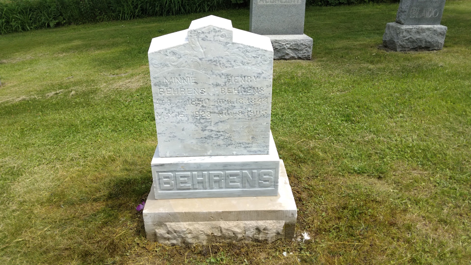 18. Hanna Friederika Wilhelmine "Mina" MARTEN1 was born on 17 April 1850 in Brenz, Neustadt, Kreis Ludwigslust-Parchim, Mecklenburg-Schwerin Province, Preussen (Prussia).6,8,46 in Altbring. She emigrated in 1868 from Germany.21,47 She appeared in the census in 1870 in Wilton Township, Monroe County, WI.7 Mina appeared in the census in 1900 in Wilton Township, Monroe County, WI.21 She appeared in the census in 1910 in Wilton Township, Monroe County, WI.25 She appeared in the census in 1920 in Tomah, Tomah Township, Monroe County, WI.47 She was living with her daughter Lizzie. Mina died on 15 May 1923 at the age of 73 in Monroe County, WI.1,15 She was buried in Ridgeville Township, Monroe County, WI.15,48 in the St. John's Evangelical Lutheran Church Cemetery. Hanna Friederika Wilhelmine "Mina" MARTEN and Heinrich "Henry" BEHRENS were married on 23 September 1869 in Ridgeville Township, Monroe County, WI.8,11,25,49 at St. John's Evangelical Lutheran Church. According to the 1910 Census, they had 11 children, of whom all 11 were living at the time of the census. They8,11,25,49 were married on 14 November 1894 in Wilton Township, Monroe County, WI.2 Heinrich "Henry" BEHRENS, son of Friedrich H. BEHRENS and Wilhelmine U. RIEGER, was born on 13 April 1844 in Alverdissen, Kreis Lippe, Nordrhein-Westfalen (North Rhine-Westphalia) Province, Preussen (Prussia).6,7,8,15,33 in Alberdissen. (His surname was spelled "Behrends" in the baptism record of his daughter Wilhelmine.) He emigrated in 1867 from Germany.18,21 (The 1900 Census indicates that he emigrated in 1869.) He appeared in the census in 1870 in Wilton Township, Monroe County, WI.7 Henry was Lutheran about 1870 in Ridgeville Township, Monroe County, WI.14 He was listed in the Church Register as member number 36 of the first 100 members of the congregation of St. John's Evangelical Lutheran Church. He was listed on the Memberbership Roster of St. John's Evangelical Lutheran Church in 1900. He appeared in the census in 1880 in Wilton Township, Monroe County, WI.6 He appeared in the census in 1900 in Wilton Township, Monroe County, WI.21 Henry died on 9 November 1905 at the age of 61 in Wilton Township, Monroe County, WI.11,15,33 He was buried on 11 November 1905 in Ridgeville Township, Monroe County, WI.15,33,48 in the St. John's Evangelical Lutheran Church Cemetery. Hanna Friederika Wilhelmine "Mina" MARTEN and Heinrich "Henry" BEHRENS had the following children: +45 | i. | Wilhelmine Marie "Minnie" BEHRENS. | +46 | ii. | Maria Lena "Mary" BEHRENS. | +47 | iii. | Elise Friedericke Christine "Lizzie" BEHRENS. | +48 | iv. | Alwine Johanna Louise "Venia" BEHRENS. | +49 | v. | Anna Margaretha "Annie" BEHRENS. | 50 | vi. | Emma Sophia BEHRENS was born on 1 April 1881 in Wilton Township, Monroe County, WI.8,46,50 She was baptized on 22 May 1881 in Ridgeville Township, Monroe County, WI.8 at the St. John's Evangelical Lutheran Church. She was confirmed on 7 April 1895 in Ridgeville Township, Monroe County, WI.50 at St. John's Evangelical Lutheran Church. Emma appeared in the census in 1900 in Wilton Township, Monroe County, WI.21 | +51 | vii. | Elisa Louisa BEHRENS. | +52 | viii. | Sophia Karoline Helene BEHRENS. | +53 | ix. | Paulina Elise "Pauline" BEHRENS. | +54 | x. | Karoline Emilie "Amelia" BEHRENS. | +55 | xi. | Wilhelm Heinrich "Henry" BEHRENS. |