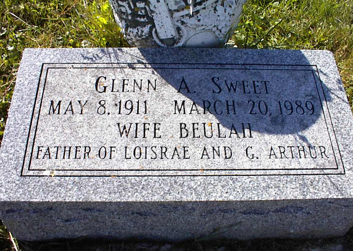 1149. Glenn Arthur SWEET Sr. was born on 8 May 1911 in Tomah, Tomah Township, Monroe County, WI.77,142,642 He appeared in the census in 1920 in La Grange Township, Monroe County, WI.106 He appeared in the census in 1930 in La Grange Township, Monroe County, WI.107 Glenn died on 20 March 1989 at the age of 77 in Gainesville, Alucha County, FL.142,642 (He may have died in Clearwater, FL.) He was buried in La Grange Township, Monroe County, WI.640 in the LaGrange Township Cemetery. Glenn Arthur SWEET Sr. and Beulah Betty REHR were married on 24 February 1936.142,645 Beulah Betty REHR was born on 19 November 1914.645 She died on 30 October 2004 at the age of 89 in Beloit, Beloit Township, Rock County, WI.642,669 Glenn Arthur SWEET Sr. and Beulah Betty REHR had the following children: |