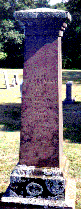 | Home Surname List Name Index Sources | Seventh Generation133. (He was not listed in the 1790 Census in Tolland Township.) About 1800 he was a Selectman in Tolland, Tolland County, CT.54 Stephen appeared in the census in 1830 in Tolland Township, Tolland County, CT.84 His household consisted of 1 male, age 20-30 (his son, Leverette); 1 male, age 50-60 (Stephen); and 1 female, age 50-60 (his wife, Elizabeth). He appeared in the census in 1850 in Tolland Township, Tolland County, CT.85 He was living with his son Ralph and his family. He died on 14 December 1856 at the age of 87 in Tolland, Tolland County, CT.31,56,82,86 Stephen was buried in Tolland Township, Tolland County, CT.87 in the South Yard Cemetery on Cider Mill Road. He and his wife share an obelisk with their son Ralph and his wife Marilda. Gravestone Inscription: "Capt Stephen Griggs Died Dec 14 1856 Aged 87. Elizabeth wife of Capt Stephen Griggs Died Feb 11 1845 Aged 74." Captain Stephen GRIGGS (~) (!) and Elizabeth "Betsey" LOTHROP were married on 8 March 1792 in Tolland, Tolland County, CT.31,53,56,57,88,89 Their family bible is in the possession of Kathy Nelson. The bible originally belonged to Elizabeth's mother. Captain Stephen GRIGGS (~) (!) and Elizabeth "Betsey" LOTHROP had the following children: |