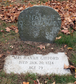 | Home Surname List Name Index Sources | Eleventh Generation1146. He was born in Mosterne, Dorsetshire, England and baptized in Bridport, Dorset, England on January 25, 1620/1 as the son of John Gallup/Gallop and his wife Christobel Bruchett. He arrived in Massachusetts on the ship Griffin with his mother and siblings September 4, 1633 three years after his father's arrival in 1630. On July 4, 1632 John Winthrop wrote the following about Christobel Gallup's fear of joining her husband in the colonies: "I have much difficulty to keep John Galloppe here by reason his wife will not come. I marvel at the woman's weakness that she will live miserably with her children there, when she might live comfortably here with her husband. I pray persuade and further her coming by all means: if she will come let her have the remainder of his wages, if not, let it be bestowed to bring over his children, for so he desires: it would be above £40 loss to him to come for her." John Gallup married Hannah Anna Lake 1643 in Boston. On February 25, 1650/1 John Gallup and his wife applied for house lots in New London, Connecticut. In 1651; "On the town street east of Stallion & Bayley, a lot was laid out to John Gallup, eight acres in the heart of town covering the space east of the town street to the beach and extending north from State Street to Federal." From the colonial records of Hartford February 9, 1652; "John Gallup in consideration and with respect unto the services his father hath done for the country, hath given him up the river of Mistick, which side he will 300 acres of upland." And the following year; "Hath given him a further addition to his land at Mistick, 150 acres, which he accepts and is satisfyde for what lands he formerly laide claim unto upon the general neck as a gift of his father's, given by General Stoughton after Pequot war." He moved to the east side of the Mystic river after this large grant of land. "He was one of the early settlers of Stonington; his homestead was bounded on the west by Mystic river, south by Captain Stanton's place and east by Captain Denison's land." In 1665 he represented the town of Stonington at the General Court. He was an Indian interpreter from 1665-1675. In 1667 he again represented the town of Stonington at the General Court. He is found on the Connecticut census of 1669 living in Stonington, Connecticut. In 1671 he was granted 100 acres of land by the General Court of Connecticut. "With Massachusetts forces he was in the Pequot War and bore himself so bravely that the General Court of Connecticut gave him a grant of 100 acres of land." January 1675 he was made Captain of the 1st Company of the Connecticut Regiment where he fought in King Phillip's War. In February 1675 in Narragansett, now South Kingston, Rhode Island having raised 70 men under Captain John Mason of Norwich, Captain John Gallup joined with him at the head of the Mohegans. On December 19, 1675 he was killed along with ten men of his company in the Great Swamp Fight, fought in Narragansett, Washington, Rhode Island. The division of his estate by order of the County Court for Stonington, New London, Connecticut: "Widow £100; son John £137; Benadam £90; to William and Samuel each £89; to five daughters each £70; Widow Hannah also a large grant of land." Although he was buried where he died in Wickford, Washington County, Rhode Island, a memorial was erected at Whitehall Burial Ground. His wife and some of his children are buried at Whitehall. The children of Captain John Gallup and his wife Hannah Ann Lake: 1. Hanah Gallup, who married Stephen Gifford 2. John Gallup IV, who married Elizabeth Harris 3. Esther Gallup, who married Henry Hodges 4. Benadam Gallup, who married Esther Prentice 5. William Gallup, who married Sarah Chesebrough 6. Samuel Gallup who never married 7. Margaret Gallup 8. Elizabeth Gallup, who married Henry Stevens 9. Christobel Gallup, who married Peter Crary 10. Mary Gallup who died young Sources: 1147. Gravestone inscription: "Under this tomb rest the remains of Hannah Lake, who came with her mother from Essex England in 1635. Married to John Gallup in Boston in 1643." Children were: