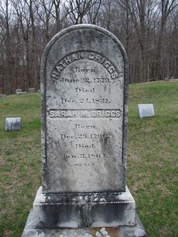64. Captain Stephen GRIGGS (*)186,310 was born on 21 June 1742 in Pomfret Township, Windham County, Connecticut Colony, British Colonial America.483,484,485,487,488,761,762 He was in 1768 in Pomfret Township, Windham County, Connecticut Colony, British Colonial America.488 "As a specimen of church discipline of that day--held to be orthodox and necessary to preserve church polity pure, until (it was said) their pastor found himself, by some backsliding, in the same category, and then and afterwards the doings of the church on that point were no longer spread out on its records--one may read on the old church records: 'April 24, 1768. Stephen Griggs and Sarah his wife made ye peace with ye church, confessing ye sine of fornication. A. Putnam, Pastor.'" "And on the same day it is recorded they ..owned the covenant." He served in the military about 1776 in New York Colony, British Colonial America.484,761,763 He was "a captain of a militia company, the First Company, Eleventh Regiment, under Captain Caleb Clark, in the Revolutionary War. He was on the march to West Chester, N.Y., in the war of the Revolution." Before 1786 Stephen was in Woodstock Township, Windham County, Connecticut Colony, British Colonial America.488 "He was a farmer, on the line of Woodstock, half a mile west of the Norwich and Worcester turnpike, where his sons Benjamin and Nathan afterwards lived." He died on 15 October 1786 at the age of 44 in Pomfret Township, Windham County, Connecticut Colony, British Colonial America.484,485,488,761,764 He was buried on 19 October 1786 in Pomfret Township, Windham County, Connecticut Colony, British Colonial America.488,765,766,767,768 in the Sabin Cemetery (also known as the South Cemetery and the Wappaquoian Burial Ground). Gravestone Inscription: "Here lies the Dust of Captain Stephen Griggs Who departed this Life Oct 15th 1786 in the 45th year of his Age. O Sons of men a warning to be An inch of time brings all to dust Rouse up from Sin from sloth awake & See in what you fix your trust. Life is a lily fair today Tomorrow in ye oven thrown Health soon will cease strength decay..." (The last line is beneath the surface of the grass and illegible.) Stephen has Ancestral File Number P1ST-RN. He has Ancestral File Number 27HQ-4V8. Sarah CHANDLER (*) and Captain Stephen GRIGGS (*) were married on 4 September 1766 in Pomfret Township, Windham County, Connecticut Colony, British Colonial America.483,484,485,497,761,769,770 65. Sarah CHANDLER (*)186,310 was born on 26 April 1740 in Pomfret Township, Windham County, Connecticut Colony, British Colonial America.484,771,772,773 She appeared in the census in 1790 in Pomfret Township, Windham County, CT.489 Sarah was a widow at the time of the census. Her household consisted of 1 male, age >16 (Benjamin, 23); 2 males, age <16 (Nathan, 14, and Stephen Chandler, 6); and 5 females (Sarah, 50, Lucinda, 13, and three unknowns). She appeared in the census in 1800 in Pomfret Township, Windham County, CT.4,490 Her household consisted of 1 male, age 0-10; 1 male, age 26-44; 1 female, age 16-25; and 1 female, age 45 and over (Sarah, 60). Aside from Sarah, the rest of the family may have been her daughter Lucinda; Lucinda's husband, John Bennett; and their son. Sarah appeared in the census in 1810 in Pomfret Township, Windham County, CT.774 Her household consisted of Sarah (then a widow), age 70; a female, age 16-25; a male, age 26-44; and a male, under 10 years of age. The others may have been her daughter Lucinda; Lucinda's husband, John Bennett; and their son. Sarah's husband, Stephen, had died in 1786 and her other children were deceased or married and living on their own. She died on 31 March 1814 at the age of 73 in Pomfret Township, Windham County, CT.484,488,764,771,773 She was buried in April 1814 in Pomfret Township, Windham County, CT.764,765,766,773 in the South Cemetery (also known as the Sabin Cemetery and the Wappaquoian Burial Ground). Gravestone Inscription: "In memory of Sarah Griggs, widow of Stephen Griggs, who died March 31 1814 In her 75th year." Sarah has Ancestral File Number P1ST-ST. Children were: | i. | Benjamin GRIGGS was born on 5 April 1767 in Pomfret Township, Windham County, Connecticut Colony, British Colonial America.483,484,488,775,776 (This is a map of Pomfret Township, CT.) He appeared in the census in 1790 in Pomfret Township, Windham County, CT.489,490 (The 1800 Census for Pomfret, Windham County, CT, contained the household of a Benjamin Griggs, with the following residents: 1 male, age 16-25; 1 male, age 26-44; 2 females, age under 10; 1 female, age 16-25; 1 female, age 26-44; and 1 female age 45 and over. That could have been his household.) He appeared in the census in 1810 in Pomfret Township, Windham County, CT.774 His household consisted of 2 males, age under 10 (Solomon and Noah); 1 male, age 26-44 (Benjamin); 1 female, age 16-25 (Polly); and 1 female, age 45 and over (his second wife, Lurene). Benjamin died on 15 October 1831 at the age of 64 in Pomfret Township, Windham County, CT.488,494,495,762 He was buried in Woodstock Township, Windham County, CT.777 in the Quasset Cemetery. | | ii. | Chloe GRIGGS was born on 21 March 1769 in Pomfret Township, Windham County, Connecticut Colony, British Colonial America.483,484,488,762,775,778 She lived in Hornby Township, Steuben County, NY in 1855.254 She died on 8 February 1859 at the age of 89 in Steuben, Oneida County, NY.495,779 Chloe was buried in Steuben, Oneida County, NY.495 in the Whitney Cemetery. | | iii. | Chester GRIGGS (1st) was born on 2 April 1771 in Pomfret Township, Windham County, Connecticut Colony, British Colonial America.483,484,488,775,776 He died on 10 March 1773 at the age of 1 in Pomfret Township, Windham County, Connecticut Colony, British Colonial America.254,488,762,775,776 He was buried in Pomfret Township, Windham County, Connecticut Colony, British Colonial America.495,764 in the South Cemetery. | | iv. | Nathan GRIGGS (1st) was 