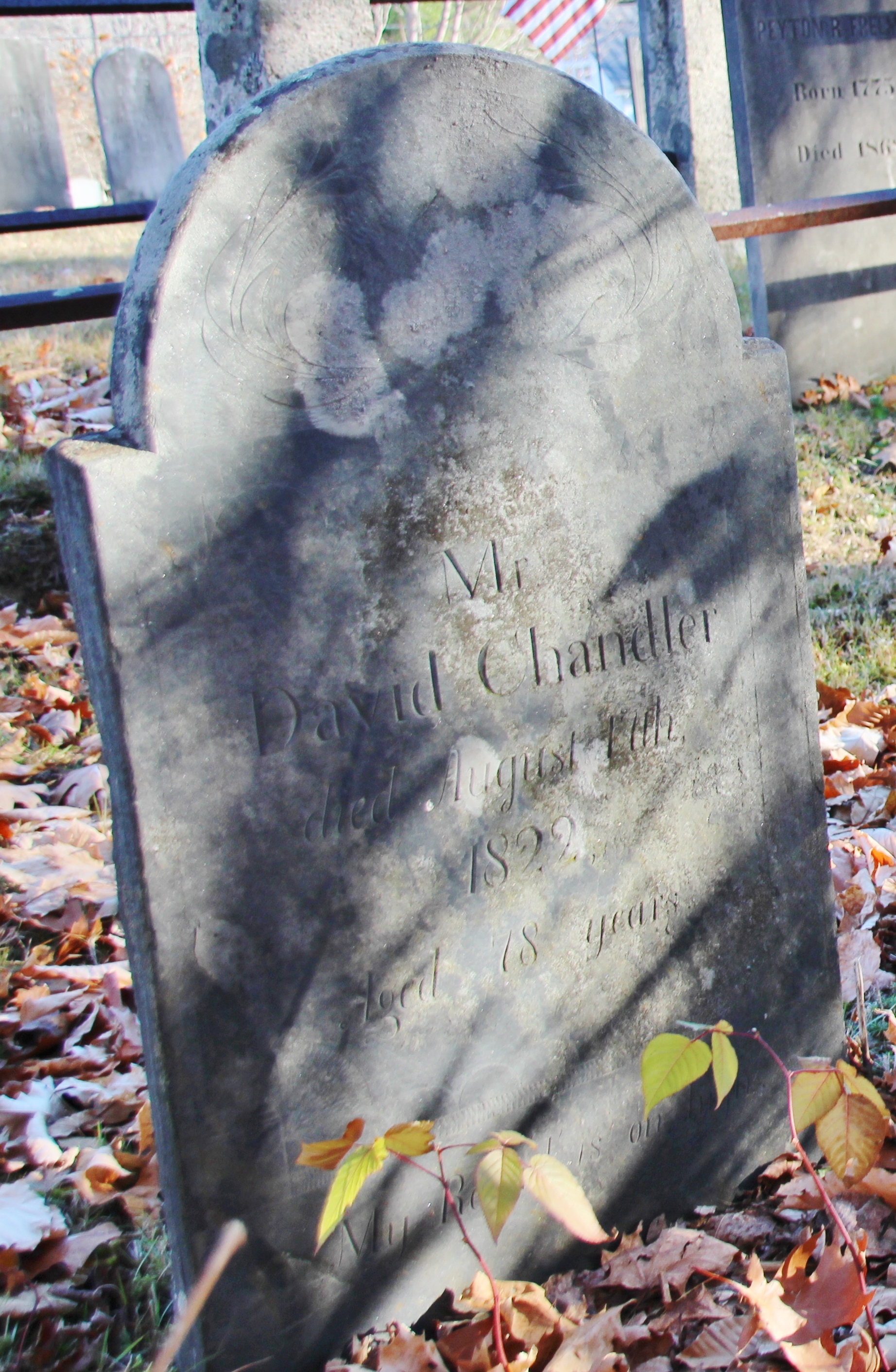 130. David CHANDLER Sr. (*)186,310 was born on 28 May 1712 in Pomfret Township, Windham County, Connecticut Colony, British Colonial America.771,897,898 In 1770 he was in Pomfret Township, Windham County, Connecticut Colony, British Colonial America.787 His occupation was "Tithingman": "an elected local official having the functions of a peace officer in various American colonies, and/or an annually elected official chosen in New England towns until well into the 19th century and charged primarily with preserving order in church during divine service and enforcing the observance of the Sabbath." He died on 2 December 1796 at the age of 84 in Pomfret Township, Windham County, CT.771,898 David has Ancestral File Number 92RC-Q4. He was buried in Pomfret Township, Windham County, CT.765,898 in the South Cemetery (also known as the Sabin Cemetery and the Wappaquoian Burial Ground). Mary Anna ALLEN (*) and David CHANDLER Sr. (*) were married on 3 June 1736 in Pomfret Township, Windham County, Connecticut Colony, British Colonial America.771,897 131. Mary Anna ALLEN (*)186,193,310 was born on 8 August 1715 in Abington, Pomfret Township, Windham County, Connecticut Colony, British Colonial America.193,771,898 She appeared in the census in 1800 in Pomfret Township, Windham County, CT.490 Her household consisted of 3 males, age 0-10; 1 male, age 10-15; 3 males, age 16-25; 1 female, age 0-10; 3 females, age 10-15; 1 female, age 16-25; 1 female, age 25-44; and 1 female, age 45 and over (Mary, 85). She was likely living with one of her children and their family. She died on 22 November 1800 at the age of 85 in Pomfret Township, Windham County, CT.771,898 Mary has Ancestral File Number 930V-9M. She was buried in Pomfret Township, Windham County, CT.765,898 in the South Cemetery (also known as the Sabin Cemetery and the Wappaquoian Burial Ground). Children were: | i. | Elijah CHANDLER186,310 was born on 3 May 1737 in Pomfret Township, Windham County, Connecticut Colony, British Colonial America.771,898 He died on 26 November 1821 at the age of 84 in Monson, Hampden County, MA.771,795,898 He has Ancestral File Number P1ST-M0. Elijah was buried in Monson, Hampden County, MA.898 in the North Main Street Cemetery. | | ii. | Mary CHANDLER186,310 was born on 14 November 1738 in Pomfret Township, Windham County, Connecticut Colony, British Colonial America.771 She died on 30 November 1784 at the age of 46.771 She has Ancestral File Number P1ST-QH. | 65 | iii. | Sarah CHANDLER (*). | | iv. | Mehitable CHANDLER186,310 was born on 14 June 1742 in Pomfret Township, Windham County, Connecticut Colony, British Colonial America.771,898 She died on 2 March 1815 at the age of 72.488,771,898 She was buried in South Woodstock, Windham County, CT.771,898 in the Quasset Cemetery. Mehitable has Ancestral File Number P1ST-V6. | | v. | David CHANDLER Jr.186,310 was born on 7 March 1744 in Pomfret Township, Windham County, Connecticut Colony, British Colonial America.771 He died on 17 August 1822 at the age of 78 in Hanover Township, Grafton County, NH.488,771 He has Ancestral File Number P1ST-WC. | | vi. | Hannah CHANDLER186,310 was born on 18 June 1745 in Pomfret Township, Windham County, Connecticut Colony, British Colonial America.771 She died on 31 December 1829 at the age of 84.488,771 She has Ancestral File Number P1SV-0T. | | vii. | Daniel CHANDLER186,310 was born on 29 March 1748 in Pomfret Township, Windham County, Connecticut Colony, British Colonial America.771 He served in the military in September 1776 in New York Colony, British Colonial America.488 "He was in Capt. Caleb Clark's company, on the 13th Sept. 1776 at New Haven, Conn., when that company was on its march to West Chester, N.Y., in the war of the Revolution; and he there received 20 shillings on account of the expense of the march. His son Daniel had the gun which he carried through the war." He died in 1844 at the age of 96.771 Daniel has Ancestral File Number P1SV-11. He was . He and his wife "moved from Pomfret, Conn., to Hanover, N.H., and owned a farm of 200 acres near the geographical centre of that town, for which he paid in 'continental' money." | | viii. | Lemuel CHANDLER186,310 was born on 6 March 1750 in Pomfret Township, Windham County, Connecticut Colony, British Colonial America.771 He died on 19 October 1754 at the age of 4 in Pomfret Township, Windham County, Connecticut Colony, British Colonial America.771 He has Ancestral File Number P1ST-FX. | | ix. | Silas CHANDLER186,310 was born on 2 February 1752 in Pomfret Township, Windham County, Connecticut Colony, British Colonial America.771 He appeared in the census in 1790 in Pomfret Township, Windham County, CT.489 His household consisted of 2 males, 16 years and over; 3 males, under 16; and 6 females. He appeared in the census in 1800 in Pomfret Township, Windham County, CT.490 It is assumed that his is the family consisting of 2 sons and 1 daughter. Silas appeared in the census in 1810 in Pomfret Township, Windham County, CT.774 It is assumed that his is the family consisting of 2 sons and 1 daughter, as in the 1800 Census. He died on 16 April 1829 at the age of 77 in Pomfret Township, Windham County, CT.488,771 He has Ancestral File Number 8LC8-JH. Silas was buried in Pomfret Township, Windham County, CT.765 in the Pomfret Township Cemetery. | | x. | Barnabas CHANDLER186,310 was born on 2 February 1752 in Pomfret Township, Windham County, Connecticut Colony, British Colonial America.771 He died on 6 October 1756 at the age of 4 in Pomfret Township, Windham County, Connecticut Colony, British Colonial America.771 He has Ancestral File Number P1ST-G4. | | xi. | Stephen CHANDLER186,310 was born on 16 February 1754 in Pomfret Township, Windham County, Connecticut Colony, British Colonial America.771 He died on 15 October 1756 at the age of 2 in Pomfret Township, Windham County, Connecticut Colony, British Colonial America.771 He has Ancestral File Number P1ST-H9. | | xii. | Chloe CHANDLE