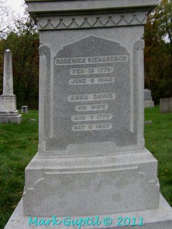 Children were: | i. | Lothrop RICHARDSON (1st)310,311 was born on 10 December 1774 in Tolland Township, Tolland County, Connecticut Colony, British Colonial America.193,265,314 He died on 16 March 1789 at the age of 14 in Tolland Township, Tolland County, CT.265,314,520 He was buried in 1789 in Tolland Township, Tolland County, CT.193,520 in the South Yard Cemetery on Cider Mill Road. Lothrop has Ancestral File Number 18WN-0FS.314 | | ii. | Achsah RICHARDSON310,311 was born on 27 August 1776 in Tolland Township, Tolland County, Connecticut Colony, British Colonial America.212,265,309,314 She appeared in the census in 1790 in Tolland Township, Tolland County, CT.521 She died on 5 March 1820 at the age of 43 in Vermont.212,265,309,314 Achsah has Ancestral File Number 18WN-0WP.314 | | iii. | Judge Roderick RICHARDSON Sr.193,310 was born on 15 February 1779 in Tolland Township, Tolland County, Connecticut Colony, British Colonial America.265,309,314 He appeared in the census in 1790 in Tolland Township, Tolland County, CT.521 In 1806 he was a storeowner in Waitsfield Township, Washington County, VT.799 He had a store on the Common (the village center) by 1806."During the first three decades of the 19th century, more and more farms were established among the hills, and the demand for services grew. The village of Waitsfield slowly took form. Roderick Richardson had a house build there by 1817. In 1831 he built a store next door. The building was damaged by fire in 1845 and the present two-story brick structure was built. It is not the Masonic Hall. In 1851, Richardson also moved a building from Irasville to the corner diagonally across from the Masonic Hall. This large building became a hotel. Its ground floor was used for fifty years as a hall for town meetings." "... at the foot of Fort Mill, Roderick Richardson built a large complex of grist and lumber mills in 1829-30. In order to supply his mills with power, he and his two partners hand-dug a canal to the river, passing behind the post office. The slough is visible today." Roderick appeared in the census in 1810 in Waitsfield Township, Chittenden County, VT.492 His household was next to that of his brother Frederick and consisted of Roderick, his wife, and their 6 sons and 1 daughter. He appeared in the census in 1820 in Waitsfield Township, Washington County, VT.493 He died on 8 June 1844 at the age of 65 in Waitsfield Township, Washington County, VT.265,314 Roderick has Ancestral File Number 18WN-CRR.314 He was buried in Waitsfield Common, Waitsfield Township, Washington County, VT.193 in the Wait Cemetery. | | iv. | Dr. Frederic RICHARDSON309,310 was born on 9 March 1780 in Tolland Township, Tolland County, Connecticut Colony, British Colonial America.193,265,314 He appeared in the census in 1790 in Tolland Township, Tolland County, CT.521 He appeared in the census in 1810 in Fayston Township, Chittenden County, VT.492 His household was next to that of his brother Roderick and consisted of Frederic, his wife, and their 4 sons and 1 daughter. Frederic appeared in the census in 1820 in Waitsfield Township, Washington County, VT.493 He died on 30 December 1860 at the age of 80 in Waitsfield Township, Washington County, VT.212,265,314 He was buried in January 1861 in Waitsfield Common, Waitsfield Township, Washington County, VT.265 in the Common Cemetery. Frederic has Ancestral File Number 18WN-DQQ.314 | | v. | Persis RICHARDSON310,311 was born on 10 March 1783 in Tolland Township, Tolland County, Connecticut Colony, British Colonial America.265,314 She appeared in the census in 1790 in Tolland Township, Tolland County, CT.521,800 (He could not be located in the 1810 Census in Vermont or Connecticut, to where his parents had moved.) She died on 27 November 1859 at the age of 76 in Roxbury, Washington County, VT.212,265,309,314 Persis has Ancestral File Number 18WN-0Z4.314 She was buried in Roxbury, Washington County, VT.193 | | vi. | Vinia RICHARDSON193,265,309,310 was born on 31 October 1785 in Tolland Township, Tolland County, Connecticut Colony, British Colonial America.193,265,309,314 She appeared in the census in 1790 in Tolland Township, Tolland County, CT.521 She appeared in the census in 1810 in Tolland Township, Tolland County, CT.800 Vinia died on 17 December 1865 at the age of 80 in Somers, Tolland County, CT.265,309,314 She has Ancestral File Number 18WN-11H.314 She was buried in Tolland, Tolland County, CT.265 in the South Yard Cemetery. | 34 | vii. | Captain Ira Judge RICHARDSON Sr. (*) (~). | | viii. | Lothrop RICHARDSON (2nd)309,310 was born on 27 August 1790 in Coventry, Tolland Township, Tolland County, CT.265,309,314 He died on 13 July 1854 at the age of 63 in New Hartford, Litchfield County, CT.193,265,309,314 He has Ancestral File Number 18WN-F97.314 Lothrop was buried in Burlington, Hartford County, CT.193 | | ix. | (Unknown Infant Twin Son) RICHARDSON265 was born on 27 August 1790 in Tolland Township, Tolland County, CT.265 He died on 27 August 1790 at the age of 0 in Tolland Township, Tolland County, Connecticut Colony, British Colonial America.265 | | x. | Roswell RICHARDSON310,311 was born on 16 November 1793 in Tolland Township, Tolland County, CT.265,309,314 He appeared in the census in 1810 in Tolland Township, Tolland County, CT.800 He appeared in the census in 1850 in Salem, Rockingham County, NH.193 Roswell appeared in the census in 1860 in Salem, Rockingham County, NH.193 He appeared in the census in 1870 in Waitsfield Township, Washington County, VT.502 His occupation was listed as "Farmer." He appeared in the census in 1880 in Waitsfield Township, Washington County, VT.503 He and his wife were living in the household of Arseneth, a widowed wife of one of his nephew's. Roswell died on 10 December 1886 at the age of 93 in Keene, Cheshire County, NH.265,314 He has Ancestral File Number 18WN-FKV.314 He was buried in Keene, Cheshire County, NH.193,265 | | xi. | Ralph RICHARDSON310,311 was born on 10 March 179