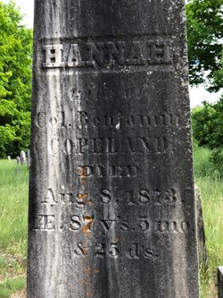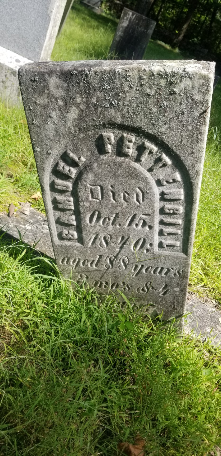 74. Samuel D. PETTINGILL Jr. (2nd) (*) was born on 12 July 1753 in Bridgewater, Plymouth County, Massachusetts Bay Colony, British Colonial America.601,804,805,806 His birth date is based on his age at the time of his death as listed in the records of The Van Wormer (Griswold) Cemetery in Fort Ann Township, NY. Based on a date of death of 15 Oct 1840 and his age as "ae 88y 3m and 4d," his birth date calculates as 11 Jul 1852. But the MyHeritage.com website lists his birth date as 12 July 1853, and his Christening date as 15 Jul 1853. Most researchers report that the son of Samuel and Martha Jackson married Martha Pratt, and their children were Silence, Levinay (or Livinia), Hannah, and Jerusha. Robbi Hoy lists the children of Samuel and Martha (Unknown) as Silence, Levinay, Hannah and Permelia (with a birth date of 13 June 1788--the same as the Permelia in Samuel and Hannah Ann Gilbert's family). The known children of Samuel and Hannah Ann Gilbert are Permelia, Clarissa, Relief and William. The 1790 Census for Mohawk Township, Montgomery County, NY contained a household of Samuel Pettingill that consisted of 1 "free white males of 16 years & upwards, including heads of households;" 1 "free white males, under 16 years;" and 2 "free white females, including heads of families." Living in the adjacent two households were the families of Martin Pettingill and Joseph Pettingill. Not too far away were the families of Benjamin Pettingill and another Joseph Pettingill. It is not known of if any of these families were related to the Samuel Pettingill in our family, but it is likely. The 1810 Census for Fort Ann, Washington County, NY contains a listing for Samuel "Pettingal" and his household consisted of 1 male, under 10; 1 male, 26-44; 4 females, under 10; 2 females, 10-15; and 1 female, 45 and over. Our Samuel would have been 56 at the time and it is also not believed that they had four daughters who were born after 1800. Although they were living in Fort Ann during the 1820 Census, that was probably not his family. Next door was the household of John Taylor, possibly related to Moses Taylor, the eventual husband of Samuel's daughter, Permelia. A few farms away were Josiah and Ephraim Griswold and Israel Bigelow, other surnames that later became related to our family. He was baptized on 15 July 1753 in Brockton, Plymouth County, Massachusetts Bay Colony, British Colonial America.804 He appeared in the census in 1820 in Fort Ann, Fort Ann Township, Washington County, NY.545 The household consisted of 1 male, age 16-26 (William, 22); 1 male, age 45 and above (Samuel, 68); and one female, age 45 and above (Hannah 68). Samuel appeared in the census in 1830 in Fort Ann, Fort Ann Township, Washington County, NY.807,808 He was listed as "Samuel Pettingal" and his household consisted of 1 male, age 20-30 (his son, William, about 32); 1 male, age 70-80 (Samuel, 78); and 1 female, age 80-90 (his wife, Hannah, 78). He was living next door to Moses Taylor, the husband of his daughter Permelia. He died on 15 October 1840 at the age of 87 in Fort Ann, Fort Ann Township, Washington County, NY.146,193,809,810,811,812,813 (The cemetery records list his date of death as 15 Oct 1840, but Evelyn Taylor's research lists it as 15 Oct 1836. The MyHeritage.com website lists the year as 1825. 1840 is believed to be correct.) He was buried in Fort Ann Township, Washington County, NY.810,812 in the Van Wormer (Griswold) Cemetery. Located on a hill on the West side of Tripoli Road, near the intersection with Burquist Road. Take the hill up Rocky Road and turn left to the Cemetery, which is surrounded by a stone wall. Hannah PRATT (*) and Samuel D. PETTINGILL Jr. (2nd) (*) were married about 1778 in Bridgewater, Plymouth County, Massachusetts Bay Colony, British Colonial America.804,811,814 The MyHeritage.com website lists their marriage location as "Worthington, Hampshire, Massachusetts Bay.) 75. Hannah PRATT (*)815,816 was born on 18 May 1754 in Stoughton, Stoughton Township, Norfolk County, Massachusetts Bay Colony, British Colonial America.146,810,815,817 Her birth date is listed as 18 May 1782 in Evelyn Taylor's research; that is not possible because her oldest daughter was born in 1779; it is possible that she meant 1752. The 1830 Census lists her in the age range of 80-90; therefore, she was apparently born between 1750 and 1760. The cemetery records list her age as 82 at the time of her death, indicating a birth year of about 1754. She appeared in the census in 1810 in Fort Ann, Fort Ann Township, Washington County, NY.539 She appeared in the census in 1820 in Fort Ann, Fort Ann Township, Washington County, NY.545 Hannah appeared in the census in 1830 in Fort Ann, Fort Ann Township, Washington County, NY.807 She died on 27 August 1836 at the age of 82 in Fort Ann Township, Washington County, NY.146,810,815,817 (Evelyn Taylor's research lists her date of death as 27 Aug 1836, and the gravestone list confirms that.) She was buried in Fort Ann Township, Washington County, NY.810,813 in the Van Wormer (Griswold) Cemetery. Located on a hill on the West side of Tripoli Road, near the intersection with Burquist Road. Take the hill up Rocky Road and turn left to the Cemetery, which is surrounded by a stone wall. (The MyHeritage.com and FamilySearch.org websites list her surname as Pratt, but other sources list it as Gilbert. It must be confirmed. It is very possible that Hannah Pratt was married to another Samuel Pettingill. The Find-a-Grave Website lists a Hannah Pratt (1757-1826) as having married Zephaniah Shaw (1752-1829) in 1776 and a Samuel Pettingill (?-1840) in 1809.) Children were: | i. | Silence PETTINGILL was born in 1779 in Worthington Township, Hampshire County, Massachusetts Bay Colony, British Colonial America.818 She was born on 22 April 1779 in Worthington Township, Hampshire County, Massachusetts Bay Colony, British Colonial America.804 She appeared in the census in 1790 in Worthington Township, Hampshire