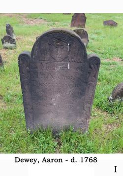 706. Israel DEWEY (*)310,399 was born on 9 July 1686 in Westfield, Westfield Township, Hampden County, Massachusetts Bay Colony, British Colonial America. After 1720 he was in Westfield, Westfield Township, Hampden County, Massachusetts Bay Colony, British Colonial America.1034 He was elected to serve as a "Selectman"--a member of a board of town officials in New England communities. They are elected to serve as the town's chief administrative authority, and they manage local affairs including: (1) leading the development of capital improvement programs; (2) developing risk management policies, such as insurance; (3) monitoring the town's financial performance; and (4) organizing elections for local, state and federal offices. In colonial times, Selectmen oversaw ten or twelve families, removed children from "unfit" parents, and ensured that fathers exercised proper family government. In 1722 he was in Westfield, Westfield Township, Hampden County, Massachusetts Bay Colony, British Colonial America.1034 He was named to a Seat in the Meeting House. Israel died on 26 January 1728 at the age of 41 in Westfield, Westfield Township, Hampden County, Massachusetts Bay Colony, British Colonial America.973 He has Ancestral File Number 9LX0-B5. He has Ancestral File Number BWPV-VF. Israel was buried in Westfield, Westfield Township, Hampden County, Massachusetts Bay Colony, British Colonial America.21,973 in the Mechanic Street Cemetery (referred to as the Old Burying Ground). Gravestone Inscription: "Israel Dewey died January 26 1728 Aged 42" Sarah ROOT (*) and Israel DEWEY (*) were married in 1713 in Of Westfield, Westfield Township, Hampden County, Massachusetts Bay Colony, British Colonial America.1035 Israel and his brother Adijah married first cousins, both named Sarah Root. 707. Sarah ROOT (*)310,399 was born on 27 July 1683 in Westfield, Westfield Township, Hampden County, Massachusetts Bay Colony, British Colonial America.671,971,1035,1036 (One source--"The Descendants of John Root"--lists her parents as Thomas Root, Sr., and Mary Gridley, his second wife.) She died on 4 April 1739 at the age of 55 in Springfield, Hampden County, Massachusetts Bay Colony, British Colonial America.1034 She has Ancestral File Number 2RB5-HX. Sarah was buried in Westfield, Westfield Township, Hampden County, Massachusetts Bay Colony, British Colonial America.1034 in the Old Burying Ground. She has Ancestral File Number 934H-6PW.254 Children were: 353 | i. | Sarah DEWEY (*). | | ii. | Constance DEWEY310,399 was born on 20 March 1716 in Westfield, Westfield Township, Hampden County, Massachusetts Bay Colony, British Colonial America. She died on 16 December 1799 at the age of 83 in Springfield, Hampden County, MA. She has Ancestral File Number J199-1X. | | iii. | (Unknown Son) DEWEY310,399 was born on 2 February 1717 in Westfield, Westfield Township, Hampden County, Massachusetts Bay Colony, British Colonial America. He died on 11 February 1717 at the age of 0 in Westfield, Westfield Township, Hampden County, Massachusetts Bay Colony, British Colonial America. He has Ancestral File Number J194-2F. | | iv. | Israel DEWEY Jr.310,399 was born on 27 January 1719 in Westfield, Westfield Township, Hampden County, Massachusetts Bay Colony, British Colonial America. He appeared in the census in 1790 in Westfield, Westfield Township, Hampden County, Massachusetts Bay Colony, British Colonial America.819 His household consisted of 1 male, age 16 and over; and 2 females. He died on 24 June 1806 at the age of 87 in Westfield, Westfield Township, Hampden County, MA. Israel has Ancestral File Number 9LWZ-ZB. | | v. | Aaron DEWEY310,399 was born on 28 April 1721 in Westfield, Westfield Township, Hampden County, Massachusetts Bay Colony, British Colonial America.265 He died on 11 June 1768 at the age of 47 in Westfield, Westfield Township, Hampden County, Massachusetts Bay Colony, British Colonial America.973 He has Ancestral File Number BXDV-79. Aaron was buried in Westfield, Westfield Township, Hampden County, Massachusetts Bay Colony, British Colonial America.265,973 in the Mechanic Street Cemetery (the Old Burying Ground).Gravestone Inscription: "In Memory of Mr. Aaron Dewey who died June 11th 1768 in the 48th Year of his Age." |