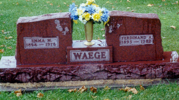 44. Ferdinand Arnold "Ferdie" WAEGE was born on 21 February 1895 in Wilton Township, Monroe County, WI.6,41 He appeared in the census in 1900 in Wilton Township, Monroe County, WI.38 He appeared in the census in 1910 in Wilton, Wilton Township, Monroe County, WI.59 Ferdie appeared in the census in 1920 in Wilton Township, Monroe County, WI.60 His occupation was "Farmer." He appeared in the census in 1930 in Wilton Township, Monroe County, WI.84 He died on 16 March 1982 at the age of 87 in Oconomowoc, Waukesha County, WI.41 Ferdie was buried on 19 March 1982 in Wilton, Wilton Township, Monroe County, WI.17,109 in the St. Paul's German Lutheran Church cemetery. Ferdinand Arnold "Ferdie" WAEGE and Emma M. CLAIRE were married on 25 October 1917 in Wilton Township, Monroe County, WI.36,41 Emma M. CLAIRE, daughter of Henry CLAIRE and Auguste W. UNKNOWN (CLAIRE), was born on 15 December 1894 in Wellington Township, Monroe County, WI.41,109 She appeared in the census in 1920 in Wilton Township, Monroe County, WI.60 She appeared in the census in 1930 in Wilton Township, Monroe County, WI.84 Emma died on 12 August 1978 at the age of 83 in Tomah, Tomah Township, Monroe County, WI.36,90 She was buried on 15 August 1978 in Wilton, Wilton Township, Monroe County, WI.17,109 in the St. Paul's German Lutheran Church cemetery. Ferdinand Arnold "Ferdie" WAEGE and Emma M. CLAIRE had the following children: 94 | i. | Claire Ferdinand WAEGE was born on 26 September 1918 in Monroe County, WI.6,115 He died in 1919 at the age of 1. He was buried in 1919 in Wilton, Wilton Township, Monroe County, WI.6,109 in the St. Paul's German Lutheran Church cemetery. | +95 | ii. | Winnafield Alfred "W. A." WAEGE. | +96 | iii. | Shirley Elaine WAEGE. | 97 | iv. | Clifton Ferdinand WAEGE was born on 29 August 1927 in Monroe County, WI.6,115 He died in 1928 at the age of 1.109 He was buried in 1928 in Wilton, Wilton Township, Monroe County, WI.6,109 in the St. Paul's German Lutheran Church cemetery. | 98 | v. | Roger Avon WAEGE was born on 24 September 1930 in Monroe County, WI.6,115 He died in 1931 at the age of 1. He was buried in 1931 in Wilton, Wilton Township, Monroe County, WI.6,109 in the St. Paul's German Lutheran Church cemetery. |