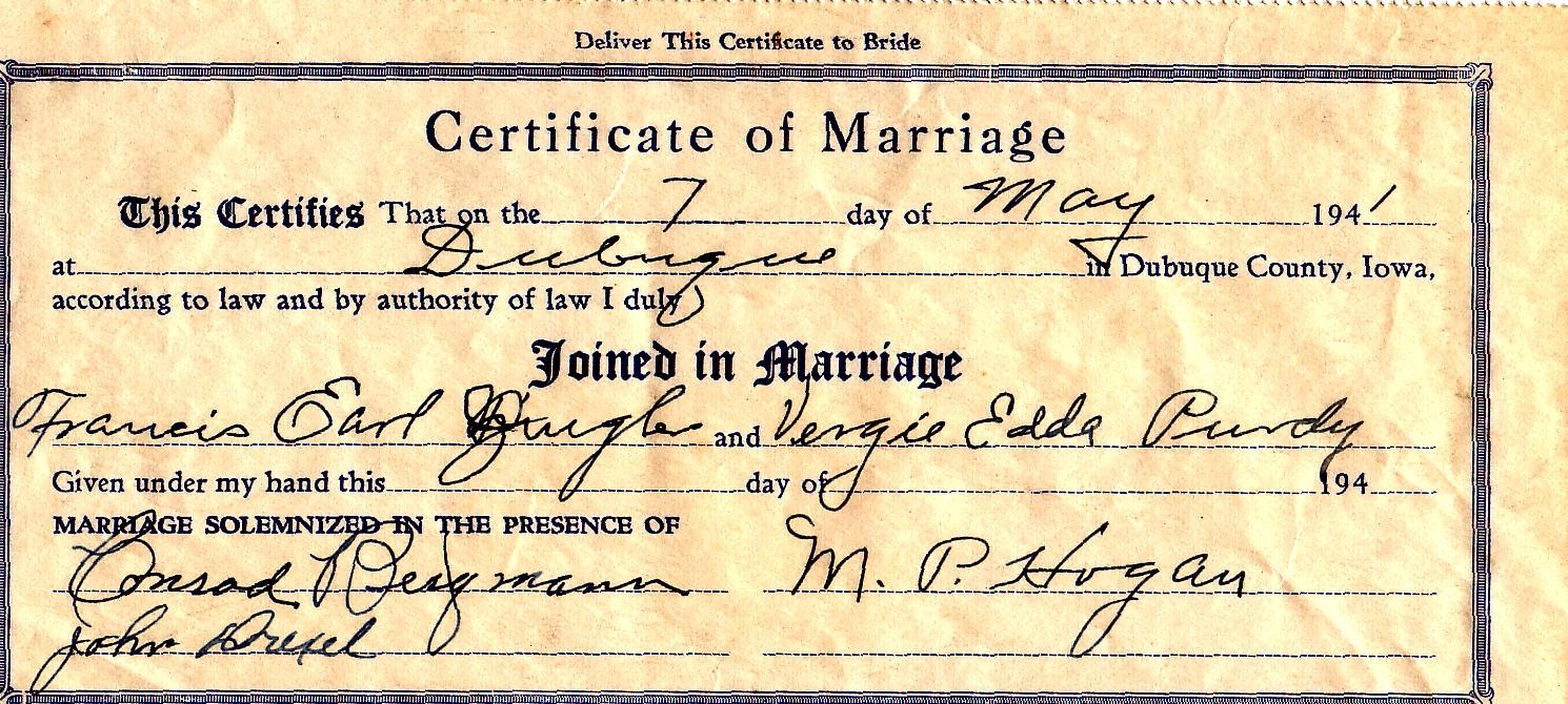 1536. Virgie Etta PURDY was born on 9 March 1916 in Wisconsin.535,890 She appeared in the census in 1930 in Lincoln Township, Monroe County, WI.536 She died on 22 June 1991 at the age of 75.374 Virgie Etta PURDY and Francis Earl "Red" ZINGLER were married on 7 May 1941 in Dubuque, Dubuque County, IA.379,890,1173 (This is a copy of their Marriage Certificate.) Francis Earl "Red" ZINGLER, son of Gustave Herbert Earl ZINGLER and Alma Rena UMBACH, was born on 25 May 1915 in Monroe County, WI.379,740,890 He died on 3 June 2002 at the age of 87 in Tomah, Tomah Township, Monroe County, WI.379 He was buried on 6 June 2002 in Tomah, Tomah Township, Monroe County, WI.374,1096 in the Oak Grove Cemetery. Virgie Etta PURDY and Francis Earl "Red" ZINGLER had the following children: |
