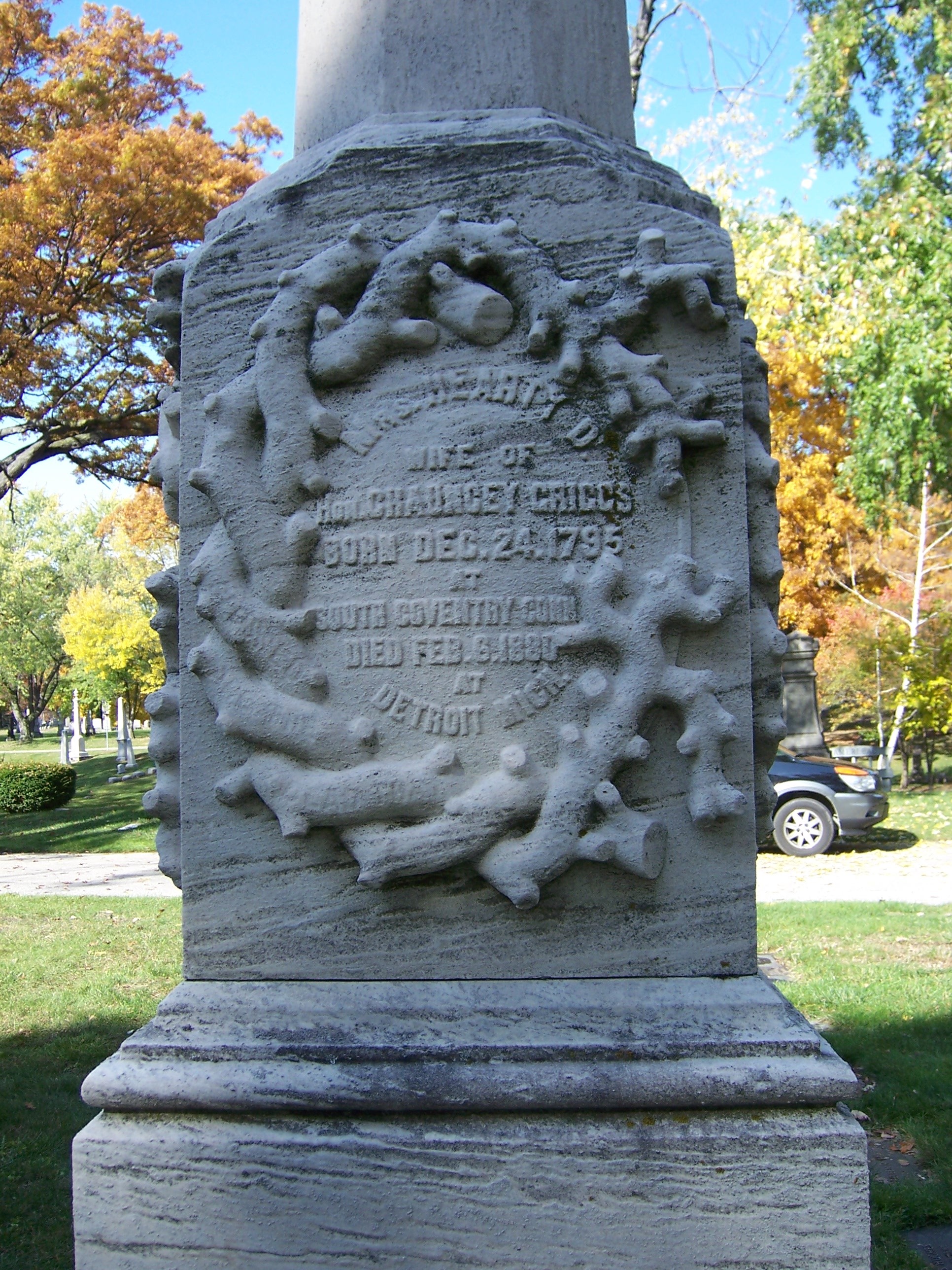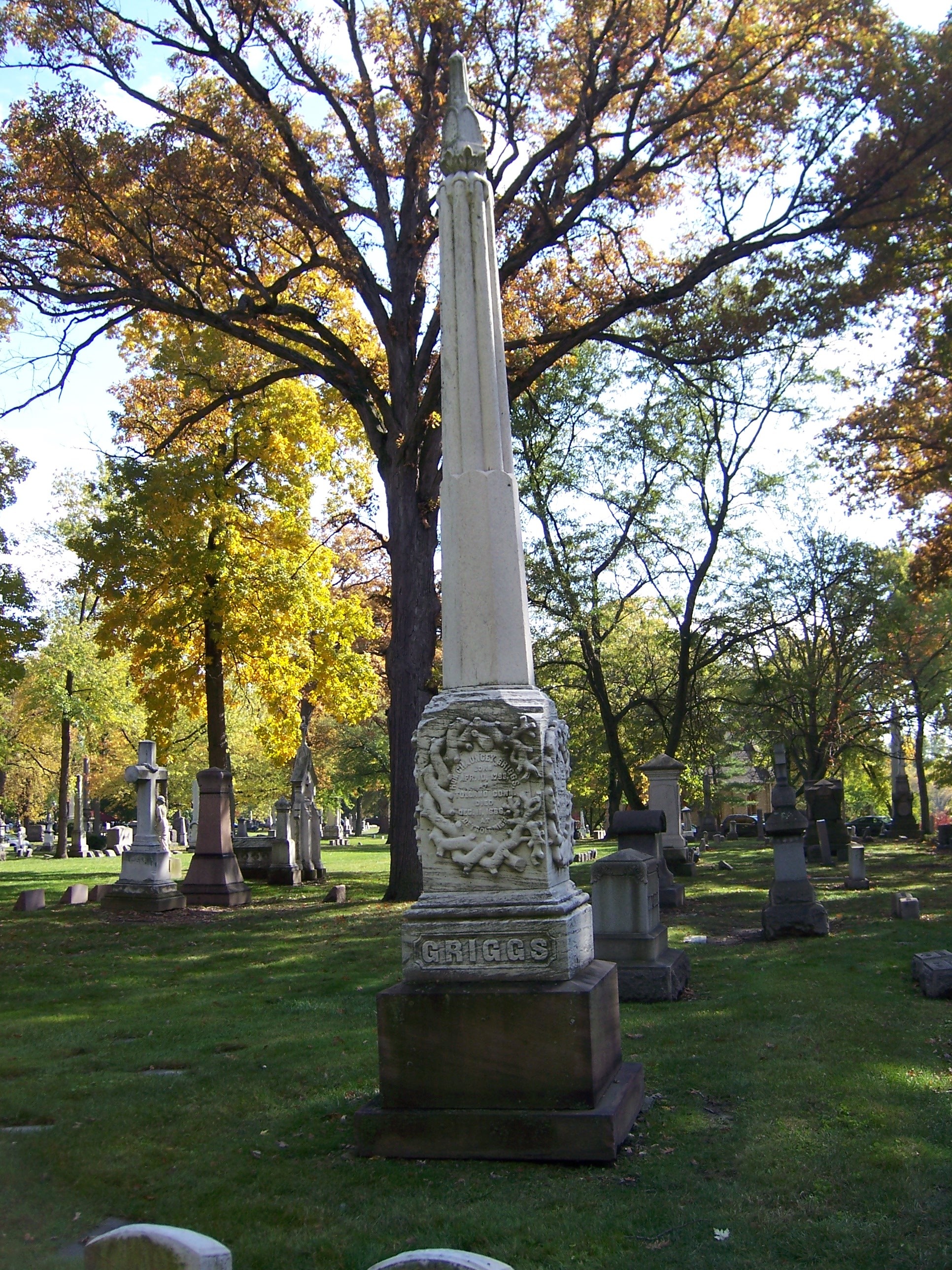 737. Honorable Chauncey GRIGGS was born on 10 April 1796 in Tolland Township, Tolland County, CT.184,238,258,261 He appeared in the census in 1830 in Tolland Township, Tolland County, CT.327 His household consisted of 1 male, age under 5; 1 male, age 5-10; 1 male, age 20-30; 1 female, age 0-5; 1 female age 15-20; and 1 female, age 30-40. About 1835 he was a member of the Connecticut Legislature, Judge of Probate Court, and Justice of the Peace for 14 years in Tolland, Tolland County, CT.84 Chauncey appeared in the census in 1850 in Tolland Township, Tolland County, CT.312 His occupation was "Farmer." He died on 11 December 1866 at the age of 70 in Detroit, Wayne County, MI.84,238,460 He was buried in Detroit, Wayne County, MI.238 in the Elmwood Cemetery.