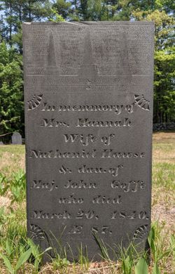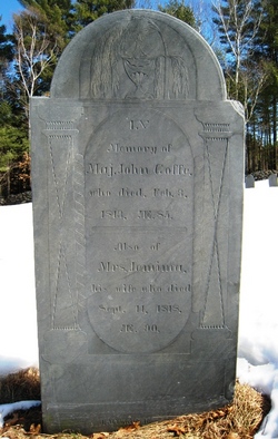 288. John Bradford GOFFE IV was born on 16 February 1727 in Bedford, Hillsborough County, New Hampshire Colony, British Colonial America.218 He died on 3 February 1813 at the age of 85 in Bedford, Hillsborough County, NH.218 He was buried in Bedford, Hillsborough County, NH.137 in the Old Bedford Cemetery. John Bradford GOFFE IV and Jemima HOLDEN were married about 1749 in Massachusetts Bay Colony, British Colonial America.199 Jemima HOLDEN was born on 24 February 1727 in Groton, Middlesex County, Massachusetts Bay Colony, British Colonial America.137,199 She died on 11 September 1818 at the age of 91 in Bedford, Hillsborough County, NH.137,199 She was buried in Bedford, Hillsborough County, NH.137 in the Old Bedford Cemetery. John Bradford GOFFE IV and Jemima HOLDEN had the following children: 470 | i. | Samuel GOFFE was born in 1750.137 He died in 1842 at the age of 92.137 He was buried in Homer, Cortland County, NY.137 in the East Homer Cemetery. | 471 | ii. | Hannah GOFFE was born on 27 March 1753.137 She died on 19 March 1840 at the age of 86.137 She was buried in Bedford, Hillsborough County, NH.137 in the Old Bedford Cemetery. | 472 | iii. | Captain John GOFFE V was born on 7 May 1755 in Bedford, Hillsborough County, New Hampshire Colony, British Colonial America.137 He died on 17 February 1848 at the age of 92 in North Winfield, Herkimer County, NY.137 He was buried in West Winfield, Herkimer County, NY.137 in the Meeting House Green Road Cemetery. | +473 | iv. | Griggs GOFFE. | 474 | v. | Reverend Joseph GOFFE was born on 7 August 1766 in Bedford, Hillsborough County, New Hampshire Colony, British Colonial America.137 He died on 24 April 1846 at the age of 79 in Millbury, Worcester County, MA.137 He was buried in Sutton, Worcester County, MA.137 in the Waters-Goffe Cemetery. | +475 | vi. | Theodore Atkinson GOFFE. | +476 | vii. | Esther GOFFE. |