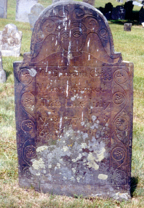 151. Ephraim GRIGGS Sr. was born on 7 November 1716 in Woodstock Township, Windham County, Connecticut Colony, British Colonial America.43,184 He died on 21 July 1779 at the age of 62 in Woodstock Township, Windham County, Connecticut Colony, British Colonial America.43,183,204,213 (He may have died in Pomfret.) He was buried in Pomfret Township, Windham County, Connecticut Colony, British Colonial America.174,182,206 in the Sabin Cemetery. Gravestone Inscription: "Mr. Ephraim Griggs, who departed this life July 21, 1779, in the 63rd year of his Age." Ephraim GRIGGS Sr. and Abigail WHITTAKER were married on 15 October 1741 in Rehoboth, Bristol County, Massachusetts Bay Colony, British Colonial America.43,183 Abigail WHITTAKER was born about 1720 in Pomfret Township, Windham County, Connecticut Colony, British Colonial America.184 (She may have been born in Woodstock, CT.) Ephraim GRIGGS Sr. and Abigail WHITTAKER had the following children: 273 | i. | Noah GRIGGS was born on 10 October 1743 in Pomfret Township, Windham County, Connecticut Colony, British Colonial America.184,214 He died on 1 October 1754 at the age of 10 in Pomfret Township, Windham County, Connecticut Colony, British Colonial America.214 | 274 | ii. | Alvin GRIGGS was born on 12 March 1746 in Pomfret Township, Windham County, Connecticut Colony, British Colonial America.184,212 He died on 9 November 1750 at the age of 4 in Pomfret Township, Windham County, Connecticut Colony, British Colonial America.212 | 275 | iii. | Phillip GRIGGS was born on 22 September 1748 in Pomfret Township, Windham County, Connecticut Colony, British Colonial America.184,214 He died on 23 September 1754 at the age of 6 in Pomfret Township, Windham County, Connecticut Colony, British Colonial America.214 | 276 | iv. | Abigail GRIGGS was born on 2 October 1754 in Pomfret Township, Windham County, Connecticut Colony, British Colonial America.184,212 She died on 2 October 1754 at the age of 0 in Pomfret Township, Windham County, Connecticut Colony, British Colonial America.212 | +277 | v. | Ephraim GRIGGS Jr.. |