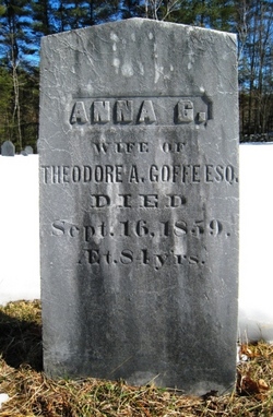 479. Anna GRIGGS was born on 18 September 1775 in Pomfret Township, Windham County, Connecticut Colony, British Colonial America.180,184,212 She appeared in the census in 1790 in Pomfret Township, Windham County, CT.203 She appeared in the census in 1800 in Pomfret Township, Windham County, CT.221 Anna GRIGGS and Theodore Atkinson GOFFE were married.137 Theodore Atkinson GOFFE, son of John Bradford GOFFE and Jemima HOLDEN, was born on 25 June 1769 in Bedford, Hillsborough County, New Hampshire Colony, British Colonial America.137 He died on 5 November 1860 at the age of 91 in Bedford, Hillsborough County, NH.137 He was buried in Bedford, Hillsborough County, NH.137 in the Old Bedford Cemetery. |
