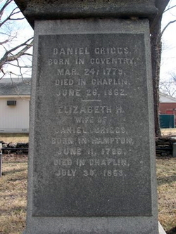 486. Daniel GRIGGS was born on 24 March 1779 in Coventry Township, Tolland County, Connecticut Colony, British Colonial America.178,199 He appeared in the census in 1850 in Chaplin, Windham County, CT.5 He appeared in the census in 1860 in Chaplin, Windham County, CT.5 Daniel died on 26 June 1862 at the age of 83 in Chaplin, Windham County, CT.178,199 He was buried in Chaplin, Windham County, CT.178 in the Chaplin Center Cemetery. Daniel GRIGGS and Elizabeth HEWITT were married on 12 January 1806 in Hampton, Windham County, Connecticut Colony, British Colonial America.5,254 Elizabeth HEWITT was born on 11 June 1786 in Hampton, Windham County, Connecticut Colony, British Colonial America.178,254 She appeared in the census in 1850 in Chaplin, Windham County, CT.5 She appeared in the census in 1860 in Chaplin, Windham County, CT.5 Elizabeth died on 30 July 1863 at the age of 77 in Connecticut.5,178,254 She was buried in Chaplin, Windham County, CT.5,178 in the Chaplin Center Cemetery. Daniel GRIGGS and Elizabeth HEWITT had the following children: |