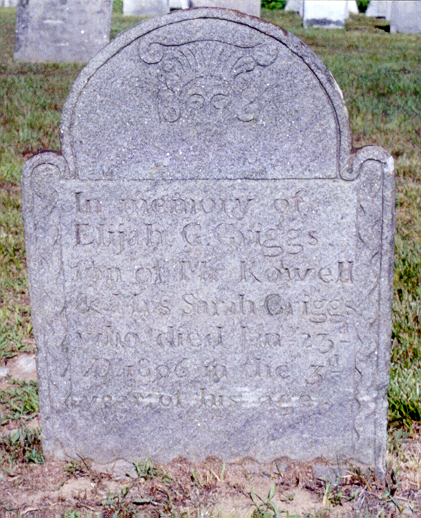 | Home Surname List Name Index Sources | Eleventh Generation502. (Tolland County was not created until 13 October 1785, so Tolland Township, which was formed in 1715, was actually part of Windham County before 1785. Also, Connecticut did not become a state until 1788, but it was an organized colony and had organized towns by 1740.) He appeared in the census in 1800 in Tolland Township, Tolland County, CT.324 His household consisted of 1 male, under age 10 (his son, Charles, 1); one male, age 26-44 (Roswell, 33); 3 females, under age 10 (his daughters, Mary, 8, Sarah, 6, and Minerva, 4); and one female, age 26-44 (his wife, Sarah, 28). He appeared in the census in 1810 in Tolland Township, Tolland County, CT.325 His household consisted of 2 males, age under 10; 1 male age 10-15; 1 male, age 26-44; 1 female, age under 10; 1 female, age 10-15; 1 female, age 16-25; and 1 female, age 26-44. Roswell appeared in the census in 1820 in Tolland Township, Tolland County, CT.326 His household consisted of 1 male, age under 10; 1 male, age 10-16; 1 male, age 45 and above; 1 female, age under 10; 2 females, age 16-26; two females, age 26-45; and 1 female, age 45 and above. He appeared in the census in 1830 in Tolland Township, Tolland County, CT.327 His household consisted of 1 male, age 10-15; 1 male, age 60-70 (Roswell); 1 female, age 15-20; and 1 female, age 50-60 (Sarah). He died on 18 September 1832 at the age of 64 in Tolland Township, Tolland County, CT.174,224 Roswell was buried in Tolland Township, Tolland County, CT.174,328 in the South Yard Cemetery on Cider Mill Road. Gravestone Inscription: "Roswell Griggs Died Sept 18 1832 Aged 65" (His and his wife's inscriptions are on the side of an obelisk of E. D. and Mary Cowen. They were her daughter Mary and her husband, Eddy Cowen.) Roswell Leonard GRIGGS Sr. and Sarah DUNHAM were married on 27 October 1791 in Tolland Township, Tolland County, CT.184,216,224,323 Gravestone Inscription: "Sarah His Wife Died Dec 23 1860 Aged 88" (She shares a gravestone with her husband.) Roswell Leonard GRIGGS Sr. and Sarah DUNHAM had the following children: