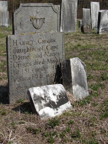 505. Captain Daniel GRIGGS Sr. was born on 15 April 1773 in Tolland Township, Tolland County, Connecticut Colony, British Colonial America.184,198 He died on 7 July 1852 at the age of 79.238 He was buried in Tolland Township, Tolland County, CT.238 in the South Cemetery. Gravestone Inscription: "Daniel Griggs Died July 7 1852 Aged 78" Captain Daniel GRIGGS Sr. and Nancy PINNEY were married on 19 January 1806 in Tolland Township, Tolland County, CT.151,238,261,329 They had 10 children. Nancy PINNEY was born in 1783 in Tolland Township, Tolland County, Connecticut Colony, British Colonial America.178,238,261 (Her surname may have been "Penney.") She died on 27 August 1844 at the age of 61 in Tolland Township, Tolland County, CT.178,238,261 She was buried in Tolland Township, Tolland County, CT.178,238 in the South Yard Cemetery. Gravestone Inscription: "Nancy Wife of Daniel Griggs Died Aug 27 1844 AE 64" Captain Daniel GRIGGS Sr. and Nancy PINNEY had the following children: +723 | i. | Joshua GRIGGS. | 724 | ii. | Eliza GRIGGS was born on 19 February 1808 in Tolland Township, Tolland County, CT.261 | 725 | iii. | Lucius GRIGGS was born on 9 January 1810 in Tolland Township, Tolland County, CT.224 | 726 | iv. | Harriet GRIGGS (1st) was born on 28 November 1811 in Tolland Township, Tolland County, CT.224,238 She died on 1 March 1815 at the age of 3.224,238 She was buried in Tolland Township, Tolland County, CT.238,329 in the South Cemetery.Gravestone Inscription: "Hariet Griggs daughter of Cap Daniel and Nancy Griggs died March 1st 1815 in the 4th year of her age" | 727 | v. | Daniel GRIGGS Jr. was born on 2 March 1814 in Tolland Township, Tolland County, CT.261 | 728 | vi. | Harriet GRIGGS (2nd) was born on 27 May 1816 in Tolland Township, Tolland County, CT.224 | 729 | vii. | Lemuel P. GRIGGS was born on 9 May 1818 in Tolland Township, Tolland County, CT.224 | 730 | viii. | Henry Obekiah GRIGGS was born on 30 March 1821 in Tolland Township, Tolland County, CT.224 | 731 | ix. | James Randolph GRIGGS was born on 6 May 1827 in Tolland Township, Tolland County, CT.224 He died on 27 April 1845 at the age of 17 in Tolland Township, Tolland County, CT.224 |