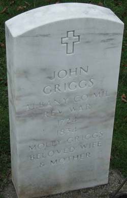 334. John Bakerman GRIGGS Sr.5,23 was born in 1734.5,23 He served in the military about 1754.5 He served in the French and Indian War in the New York Colony. He served in the military about 1776.5,23 According to his gravestone, he served in the Revolutionary War as part of the Albany County Militia. John died in 1834 at the age of 100 in Centerport, Cayuga County, NY.5,23 He was buried in Port Byron, Cayuga County, NY.5,23 in the Wilson-Dixon Cemetery. John Bakerman GRIGGS Sr. and Martha "Molly" SCHENCK were married about 1772 in New York Colony, British Colonial America.5 Martha "Molly" SCHENCK5 was born in 1755 in France.5 She died about 1850 at the age of 95 in Cayuga County, NY.5 She was buried in Port Byron, Cayuga County, NY.5,23 in the Wilson-Dixon Cemetery. John Bakerman GRIGGS Sr. and Martha "Molly" SCHENCK had the following children: |