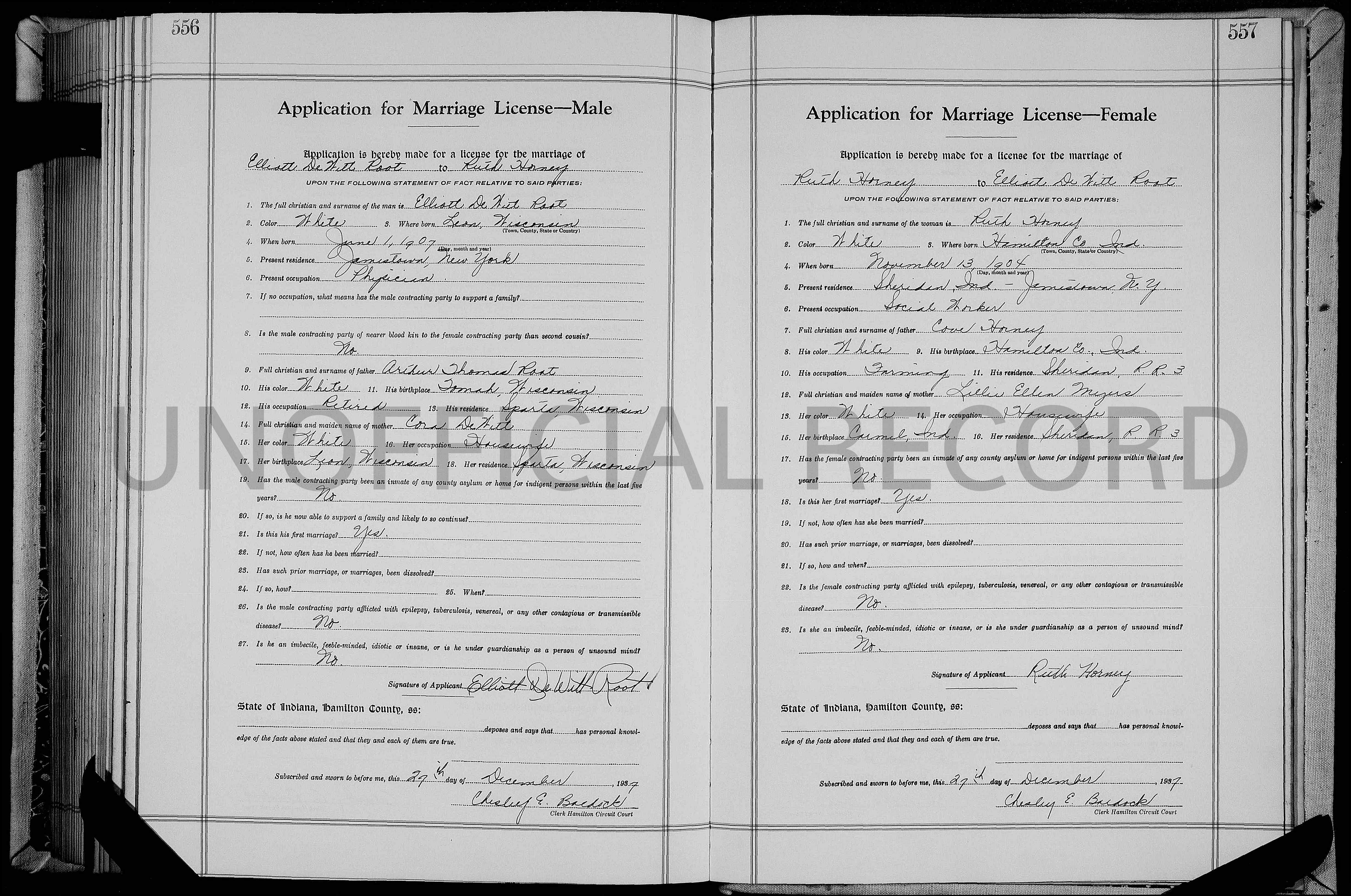 | Home Surname List Name Index Sources | Seventeenth Generation370. . He appeared in the census in 1910 in Leon Township, Monroe County, WI.102 He appeared in the census in 1920 in Sparta, Sparta Township, Monroe County, WI.103 Elliott appeared in the census in 1930 in Sparta, Sparta Township, Monroe County, WI.219 He was living with his parents. About 1938 he was an eye, ear, nose and throat surgeon in Jamestown, Chautauqua County, NY.332,334 He appeared in the census in 1940 in Jamestown, Chautauqua County, NY.334 His occupation was "Medical Doctor, Private Practice." Elliott died on 6 September 1961 at the age of 54 in Sparta, Sparta Township, Monroe County, WI.170,233,335 He was buried in Sparta, Sparta Township, Monroe County, WI.73 in the Woodlawn Cemetery. Doctor Elliott DeWitt ROOT and Ruth H. HORNEY were married on 28 December 1937 in Hortonville, Hamilton County, IN.8,99,170 Their marriage license application lists his occupation as "Physician" in Jamestown, NY. Her occupation was "Social Worker." . Ruth H. HORNEY, daughter of Cove HORNEY and Lillie Ellen MYERS, was born on 13 November 1904 in Hamilton County, IN.8,334 She appeared in the census in 1940 in Jamestown, Chautauqua County, NY.334 She died on 13 March 1991 at the age of 86 in Minneapolis, Hennepin County, MN.4 Ruth was buried in Sparta, Sparta Township, Monroe County, WI.73 in the Woodlawn Cemetery. Doctor Elliott DeWitt ROOT and Ruth H. HORNEY had the following children: