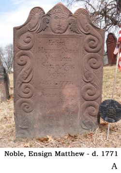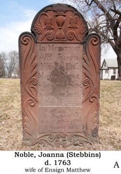 92. Ensign Matthew NOBLE Jr.10 was born on 9 September 1698 in Westfield, Westfield Township, Hampden County, Massachusetts Bay Colony, British Colonial America.10,36 He died on 8 August 1771 at the age of 72 in Westfield, Westfield Township, Hampden County, Massachusetts Bay Colony, British Colonial America.10 He was buried in Westfield, Westfield Township, Hampden County, Massachusetts Bay Colony, British Colonial America.10 Ensign Matthew NOBLE Jr. and Joanna STEBBINS were married in 1720.10 Joanna STEBBINS10, daughter of Samuel Wright STEBBINS and Joanna LAMB, was born on 4 March 1697 in Springfield, Hampden County, Massachusetts Bay Colony, British Colonial America.10 She died on 1 November 1763 at the age of 66 in Westfield, Westfield Township, Hampden County, Massachusetts Bay Colony, British Colonial America.10 She was buried in Westfield, Westfield Township, Hampden County, Massachusetts Bay Colony, British Colonial America.10 in the Old Burying Ground. Ensign Matthew NOBLE Jr. and Mercy DAY were married.10 Mercy DAY10 was born in 1703.10 She died in 1771 at the age of 68.10 |