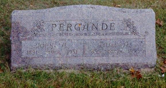 156. Johann Albert August "Jack" PERGANDE was born on 23 July 1891 in Wilton Township, Monroe County, WI.67,89,107,395,415 He was baptized on 20 September 1891 in Ridgeville Township, Monroe County, WI.415 at St. John's Evangelical Lutheran Church. He appeared in the census in 1900 in Wilton Township, Monroe County, WI.42 Jack appeared in the census in 1905 in Wilton Township, Monroe County, WI.174 He was listed as "Johnnie." He was confirmed on 8 April 1906 in Ridgeville Township, Monroe County, WI.395 at St. John's Evangelical Lutheran Church. He appeared in the census in 1910 in Wilton Township, Monroe County, WI.68 Jack appeared in the census in 1920 in Wilton Township, Monroe County, WI.116 He appeared in the census in 1930 in La Grange Township, Monroe County, WI.151 In 1930 he was a rural mail carrier in La Grange Township, Monroe County, WI.151 Jack appeared in the census in 1950 in La Grange Township, Monroe County, WI.317 His occupation was "Farmer, Farm." He died on 15 February 1951 at the age of 59.67,107 He was buried on 18 February 1951 in Tomah, Tomah Township, Monroe County, WI.67,336 in the Oak Grove Cemetery. Johann Albert August "Jack" PERGANDE and Mathilde A. "Tillie" SONNENBERG were married.107,430 Mathilde A. "Tillie" SONNENBERG, daughter of Friedrich Herman SONNENBERG and Albertina GRUHLKE, was born on 9 December 1894 in Wisconsin.42,116,336,430 (The Oak Grove Cemetery records list his birth year as 1895.) She appeared in the census in 1895 in Wellington Township, Monroe County, WI.72 She appeared in the census in 1900 in Wellington Township, Monroe County, WI.42 Her name was listed as "Tilla." Tillie appeared in the census in 1905 in Wellington Township, Monroe County, WI.174 She was listed as "Otilia." She appeared in the census in 1910 in Wilton Township, Monroe County, WI.68 She appeared in the census in 1920 in Wilton Township, Monroe County, WI.116 Tillie appeared in the census in 1930 in La Grange Township, Monroe County, WI.151 She appeared in the census in 1950 in La Grange Township, Monroe County, WI.317 She died in 1959 at the age of 65.336,430 Tillie was buried in 1959 in Tomah, Tomah Township, Monroe County, WI.67,336 in the Oak Grove Cemetery. (Near her gravestone are others stones marked "Father, Doulve Post, 1868-1926" and "Mother, Mary F., 1873-1931." It is not known what relationship, in any, these people are to Tillie.) Johann Albert August "Jack" PERGANDE and Mathilde A. "Tillie" SONNENBERG had the following children: 346 | i. | Inez Bernice PERGANDE was born on 16 June 1916 in Wilton Township, Monroe County, WI.116,336,382,430 She was baptized on 23 July 1916.382 She appeared in the census in 1920 in Wilton Township, Monroe County, WI.116 Inez died in 1926 at the age of 10.336,430 She was buried in 1926 in Tomah, Tomah Township, Monroe County, WI.67,336 at Oak Grove Cemetery. | +347 | ii. | Vernon LeRoy PERGANDE. | +348 | iii. | Kenneth PERGANDE. |