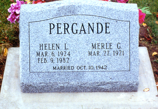 | Home Surname List Name Index Sources | Sixth Generation358. Obituary Notes: "Merle G. Pergande, 88, of Tomah, passed away peacefully Sunday, Aug. 9, 2009, at Franciscan Skemp Healthcare at Sparta. He was born March 27, 1921, to George and Elda (Marten) Pergande in the Town of Wilton. He was baptized and confirmed in the Lutheran faith at St. John Ev. Lutheran Church, Ridgeville. He was united in marriage to Helen L. Schaefer on Oct. 10, 1942. They lived in the Ridgeville area for most of their lives. She preceded him in death on Feb. 9, 1982. Merle was a truck driver at Concrete Products for many years. He loved to fish, garden and spend time with his friends and family. He loved watching his great-grandchildren run and play, especially his great-granddaughter Mackenzie, “My Little Dolly”. Merle was a faithful member of St. John Ev. Lutheran Church. He will sadly missed by all who knew and loved him. He is survived by his children, Richard (Judy) of Dubuque, IA, Eileen (Ralph) White of Potosi, Merle Jr. of Platteville, Judy (Bob) Johnson, Dan (Doris) and Ronald (Wanda), all of Dubuque, IA, Deb (Everett) Wallace of Tomah; a daughter-in-law, Sue Pergande of Hazel Green; 32 grandchildren, 86 great-grandchildren, and five great-great grandchildren, many other relatives and friends. In addition to his wife Helen and his parents, he was preceded in death by two sons, Herman, and Robert; a daughter, Mary Jo, and two infant twins; a daughter-in-law, Elizabeth Pergande; two granddaughters, Tammy and Jennifer; a grandson, Timothy; a great-granddaughter, Chelsie; three great-grandsons, Kaden, Ryan, and Reggie, and three brothers, Lloyd, Ray and Myron. Funeral services were held today (Thursday), Aug. 13, at 11 a.m. at St. John Ev. Lutheran Church, Town of Ridgeville. Pastor Matthew Minzlaff officiated. Burial was in St. John’s Lutheran Cemetery in the Town of Ridgeville with military honors by the Grassman-Sowle-Larsen-Senz American Legion Post #201. Relatives and friends called at the Sonnenburg Family Funeral Home, Tomah, on Wednesday from 4 to 8 p.m. and at the church today from 10 a.m. until time of the services." Merle George PERGANDE Sr. and Louisa Helene "Helen" SCHAEFER were married on 10 October 1942 in Ridgeville Township, Monroe County, WI.59,360,422,438 Merle George PERGANDE Sr. and Louisa Helene "Helen" SCHAEFER had the following children: