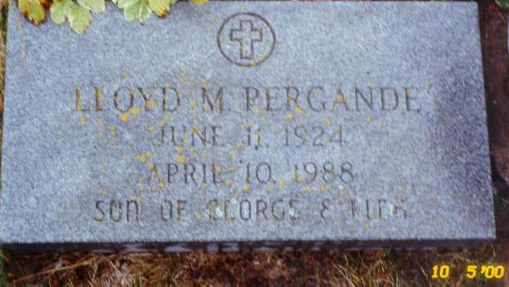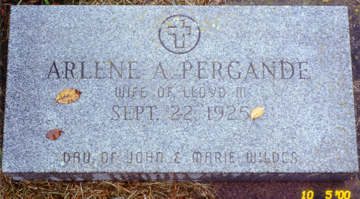 | Home Surname List Name Index Sources | Sixth Generation359. Lloyd Maynard "Bootie" PERGANDE and Arlene Arabelle "Lena" WILDES were married on 27 November 1943 in Ridgeville Township, Monroe County, WI.59,422,538 Obituary Notes: "Arlene A. “Lena” Pergande, age 81, of Milton, formerly of Janesville and Norwalk, died Thursday, March 29, 2007, at Golden Living Center, Fort Atkinson. She was born in Glendale Township, Monroe County, near Kendall, WI, on Sept. 22, 1925, the daughter of John and Marie (Jensen) Wildes. Arlene graduated from Wilton High School in 1943 and trained to be a nurse’s aide. She married Lloyd M. “Bootie” Pergande on Nov. 27, 1943, in Ridgeville, WI. He preceded her in death on April 10, 1988. Arlene and Lloyd moved to the Janesville/Milton area in 1954. She was employed as a Home Health Nurse at the Visiting Nurse Association. She is survived by her five children: Gary (Carolyn) Pergande and Jeffrey (Jan) Pergande, both of Janesville, John Pergande of Madison, SuAnne (Carl) Alessandro of California and Kathy (Keith) Hammen of Cambridge; 13 grandchildren; and 21 great-grandchildren. She was preceded in death by her parents; husband; two sons, Terrence and David Pergande; one brother, John Wildes, and two sisters, Grace Ludeking and Gwen Zellmer. Funeral services will be held at noon on Wednesday, April 4, at St. John’s Lutheran Church, Ridgeville. Burial will be in St. John’s Lutheran Cemetery, Ridgeville. Visitation will be held on Monday, April 2, from 4 to 7 p.m. at the Schneider Apfel Schneider & Schneider Funeral Home, Janesville, and from 11:30 a.m. until time of the service on Wednesday, April 4, at the church in Ridgeville." She was buried on 4 April 2007 in Ridgeville Township, Monroe County, WI.59 in the St. John's Evangelical Lutheran Church Cemetery. Lloyd Maynard "Bootie" PERGANDE and Arlene Arabelle "Lena" WILDES had the following children:
