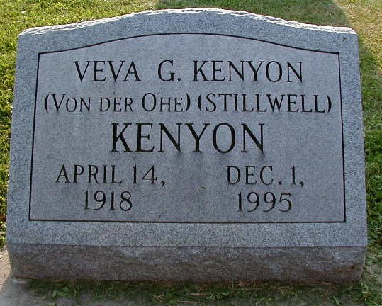| Home Surname List Name Index Sources | Twelfth Generation394. Obituary Notes: "Veva G. Kenyon, 77, of Tomah, passed away Friday, Dec. 1, 1995, at Lutheran Hospital in La Crosse (she actually passed away in the ambulance between Tomah and La Crosse of a heart aneurysm). She was born April 14, 1918, to Charles and Harriet (Shookman) Kenyon in Duluth, Minn. Veva retired in 1980, after managing the VA Credit Union for 26 years. She is survived by two sons, Robert (Jill) Von der Ohe of Rockford, Ill. and John (Colleen) Stillwell of Wausau; two daughters, Linda (Joel) Lange of Walden, NY, and Cynthia (Guy) Bradbury of Eagle River; two step-daughters, Mary (Bernard) Johnson of Janesville and Sybil Stillwell of Madison; three brothers, Glenn (Deloris) Kenyon of Sparta, Kyle (Xena) Kenyon of Tomah and James (Bernice) Kenyon of Titusville, Fla.; two sisters, Helen Kelley of Tomah and Kathleen Von Fumeti of Dubuque, Iowa; nine grandchildren and five great-grandchildren. She was preceded in death by two sisters, Doris Hart and Jeanette Storkel, and one step-daughter, Melissa (Stillwell) Anderson. Funeral services will be held Tuesday, Dec. 5, 1995, at 10 A.M. at the White Funeral Home in Tomah." She was buried on 5 December 1995 in Tomah, Tomah Township, Monroe County, WI.101,228 in the LaGrange Township Cemetery. Veva Gwendoline KENYON (`) (~) and Gale Robert VON DER OHE were married on 14 January 1940.114 Gale Robert VON DER OHE, son of Adolph Gustar VON DER OHE and Clara Wilhelmine GADE, was born on 22 August 1916 in West Salem, La Crosse County, WI.259 He died on 25 July 1954 at the age of 37 in Sparta, Sparta Township, Monroe County, WI.259 Veva Gwendoline KENYON (`) (~) and Gale Robert VON DER OHE had the following children: