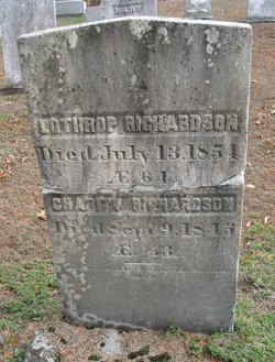 | Home Surname List Name Index Sources | Seventh Generation75. Lothrop RICHARDSON (2nd) and Charity SKINNER were married on 20 April 1813 in Tolland, Tolland County, CT.26,47,56 Charity SKINNER was born on 19 July 1792 in Shelburne Falls, Franklin County, MA.26,56 She died on 9 September 1845 at the age of 53 in Burlington, Hartford County, CT.52,56 She was buried in Burlington, Hartford County, CT.26 in the Burlington Center Cemetery. Lothrop RICHARDSON (2nd) and Charity SKINNER had the following children: