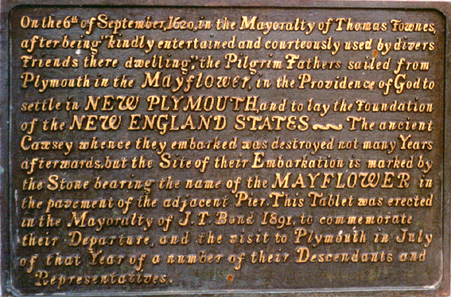 | Home Surname List Name Index Sources | Second Generation4. (This is a picture of the plaque in Plymouth, England, commemorating the departure of the Mayflower. It is located near the dock where the Mayflower departed; that departure dock was destroyed in the early 1620's.) From MayflowerFamilies.com: "On 2 July 1667 she was 'whipt att the post' for commiting fornication for the second time (PCT 4:162)." Elizabeth SOULE and Francis WALKER were married before 23 July 1668.2,11 Francis WALKER was born (date unknown). |