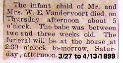 663. William Edgar "Will" VANDERVORT was born on 12 August 1858 in Oconomowoc, Waukesha County, WI.45,56,126,325,326,330 He appeared in the census in 1860 in Monterey, Oconomowoc Township, Waukesha County, WI.464 He appeared in the census in 1875 in La Grange Township, Monroe County, WI.118 Will appeared in the census in 1880 in Yellow Bank Township, Lac Qui Parle, MN.464,465 He was living next door to his brother Lewis. Will homesteaded the land with his brother Lewis in Lac Qui Parle County, purchasing the land in October 1881 for $1.25 per acre. The land was sold five years later for $412.50 per acre. William lived in Milbank, SD, after the land sale, until he moved to Santa Cruz, CA, in 1908. He appeared in the census in 1900 in Milbank, Grant County, SD.464 He lived at his home in Milbank, Grant County, SD in October 1906.313 Will appeared in the census in 1910 in Santa Cruz, Branciforte Township, Santa Cruz County, CA.464 His household was at 87 Windham Street. He lived in Santa Cruz, Branciforte Township, Santa Cruz County, CA in May 1917.341 He appeared in the census in 1920 in Santa Cruz, Branciforte Township, Santa Cruz County, CA.464,466 Will appeared in the census in 1930 in Santa Cruz, Branciforte Township, Santa Cruz County, CA.467 He died on 21 October 1937 at the age of 79 in Santa Cruz, Branciforte Township, Santa Cruz County, CA.45,126,325,326,468 Obituary Notes: "In Santa Cruz, October 21, 1937, William Edgar Vandervort, age 79 years, native of Wisconsin. Funeral will be held today (Saturday) at 2 o'clock from the White Mortuary chapel. Friends respectfully invited to attend. Interment at the family plot in Oakwood Cemetery." William Edgar "Will" VANDERVORT and Kate Katura "Katie" MEDD were married on 22 February 1882 in La Grange Township, Monroe County, WI.45,62,126,348,469,470,471,472 They were married at the home of the bride's parents. At the time of their marriage, Will was living in Odessa, MN, and Kate was living in LaGrange Township. From an article in the March 25, 1882 Tomah Journal: "The young men, Wm. E. and J. Vandervort, who left here last week for Odessa, Minnesota, arrived at their destination all well." Kate Katura "Katie" MEDD, daughter of John MEDD and Catherine A. ROUSE, was born on 1 September 1860 in West Salem, La Crosse County, WI.45,326,348 She appeared in the census in 1870 in Sparta, Sparta Township, Monroe County, WI.56 She appeared in the census in 1880 in Shelby Township, La Crosse County, WI.464 Her occupation was listed as "School Teacher." Katie appeared in the census in 1900 in Milbank, Grant County, SD.464 She appeared in the census in 1910 in Santa Cruz, Branciforte Township, Santa Cruz County, CA.464 She appeared in the census in 1920 in Santa Cruz, Branciforte Township, Santa Cruz County, CA.466 Katie appeared in the census in 1930 in Santa Cruz, Branciforte Township, Santa Cruz County, CA.467 She died on 1 May 1938 at the age of 77 in Santa Cruz, Branciforte Township, Santa Cruz County, CA.45,326,348 William Edgar "Will" VANDERVORT and Kate Katura "Katie" MEDD had the following children: +864 | i. | Lulu Agnes VANDERVORT. | +865 | ii. | Alice Edith VANDERVORT. | +866 | iii. | Nina Mae VANDERVORT. | +867 | iv. | Charles Thomas VANDERVORT. | 868 | v. | Gladys Marian VANDERVORT was born on 27 March 1899 in Milbank, Grant County, SD.45,326 She died on 13 April 1899 at the age of 0 in Milbank, Grant County, SD.45,326,338,464,473 Obituary Notes: "The infant child of Mr. and Mrs. W. E. Vandervort died on Thursday afternoon about 5 o'clock. The babe was between two and three weeks old. The funeral will be at the house at 2:30 o'clock tomorrow, Saturday afternoon." The Vandervort Family Bible lists her age as 13 days when she died. |