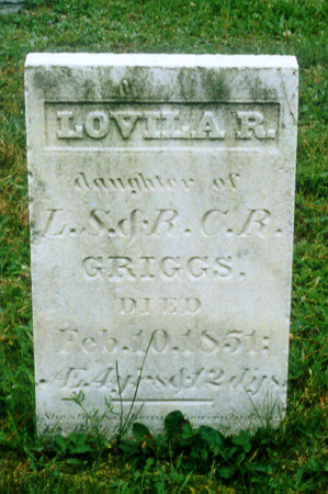 | Home Surname List Name Index Sources | Ninth Generation102. Her name was listed as "R. Cordelia" on her marriage record, as "C. R. Griggs" on the marriage registration record of her son Osmon, and as "Cordelia Griggs" on the marriage certificate of her son Clarence. Her husband referred to her as "Cordelia" in a letter that he wrote to his brother Roswell and his family on 13 February 1863. (Gary Griggs has a copy of the letter, the original of which is in the Griggs-Bragg Family Collection in the Vermont Historical Museum.) In the 1850, 1860 and 1870 Census', she was listed as "Rachel." She appeared in the census in 1830 in Fayston Township, Washington County, VT.61 She appeared in the census in 1840 in Fayston Township, Washington County, VT.62 Cordelia appeared in the census in 1850 in Colchester, Chittenden County, VT.92 She appeared in the census in 1855 in Barre Mills, Barre Township, La Crosse County, WI.93 She appeared in the census in 1860 in Barre Township, La Crosse County, WI.68 Cordelia appeared in the census in 1870 in Tomah, Tomah Township, Monroe County, WI.85 She appeared in the census in 1875 in Tomah Township, Monroe County, WI.94 She died on 12 August 1877 at the age of 56 in Tomah, Tomah Township, Monroe County, WI.84,87,95,96,97,98 Obituary Notes: "In Tomah, Wis., Sunday, Aug. 12, 1877, Mrs. R. C. Griggs, wife of Mr. L. S. Griggs, in the 58th year of her age. Her last sickness of 15 weeks was one of great suffering." It was very unusual for women to have obituaries in the newspapers at the time that Rachel died. Hers was at the top center of the front page of the Tomah Journal on both August 18 and August 25, 1877--probably because her husband's drug store was a prominent advertiser in the newspaper, and he and the newspaper publisher were friends. It is not known what caused her death, but it may have been an infectious or spreading disease such as pneumonia. Her oldest son, Osman, died four days after her death. He was a doctor, and it is possible that he was treating her. In a letter that her husband Lucius wrote to his brother Roswell on August 3-10, 1879, he stated "...it will be 2 years Tuesday since Cordelia died and 4 days later that Osmon. I do not suppose there has been 12 hours since but that my mind & thoughts have been there and I suffer in mind & feelings as much & feel the loss of Cordelia as at the time and do not know but I shall as long as I live. No one to sympathize with or speak to & I feel that I am alone by night & by day." Cordelia was buried in August 1877 in Tomah, Tomah Township, Monroe County, WI.84,98 in the Oak Grove Cemetery (Original Plat, Block 2, Lot 70). She shares a obelisk gravestone marker with her oldest son, Osmon. Rachel "Cordelia" RICHARDSON (*) (~) and Lucius Smith GRIGGS (*) (~) were married on 3 January 1841 in Waitsfield Township, Washington County, VT.48,79,87,93,99,100,101,102 According to their marriage record, they were both residents of Fayston Township and their marriage ceremony was performed by "Ira Beard, Minister." His birth place is listed as "Fayston, Washington Co., Vermont" on the record of his marriage to Kate Gilmore. At the time of his birth, Fayston was actually in Jefferson County, which was renamed Washington County in 1814. Fayston is not a village or city, but a township located northwest of the villages of Irasville and Waitsfield. (The LDS State Microfiche records list his birth place as Pomfret, Windham Co., CT, but that is believed to have been an error.) He appeared in the census in 1820 in Fayston Township, Washington County, VT.106 He appeared in the census in 1830 in Fayston Township, Washington County, VT.107 Lucius appeared in the census in 1840 in Fayston Township, Washington County, VT.108 He lived in Colchester, Chittenden County, VT about 1845.92 He and his family moved to Colchester sometime between 1841 and 1850, when they were listed there in the Census. His daughter Lovila is believed to have been born in Colchester in 1847. He appeared in the census in 1850 in Colchester, Chittenden County, VT.92,102 He was managing a Boarding House, with seven tenants listed in the census, in addition to his family. His family consisted of Lucius, age 39; Rachel, 29; and their children, Osmon, 5; and Lovila, 3. Lucius appeared in the census in June 1855 in Barre Mills, Barre Township, La Crosse County, WI.93,102,109,110 His household consisted of 2 men (Lucius and his son, Osman) and 1 woman (his wife, Rachel "Cordelia.") He may have been renting his farm at that time. On August 10, 1858, Lucius purchased 40 acres of land in La Crosse County. The land is described as "the South West quarter of the South East quarter of Section Two in Township Fifteen, North of Range Six West, in the District of lands subject to sale, at La Crosse, Wisconsin." Gary Griggs has a copy of the patent that was granted when he purchased the land; the patent contains the name of President James Buchanan. He appeared in the census in 1860 in Barre Township, La Crosse County, WI.68 His household consisted of Lucius, age 49, occupation "Farmer"; his wife Rachel "Cordelia," age 38; their son Osman, age 15, "Laborer"; their son Clarence, age 3; their daughter Florence, age 3; their daughter Harriet, age 3 months; and his mother-in-law, Rachel (Durkee) Richardson, age 60. Between 1865 and 1874 he was a druggist in Tomah, Tomah Township, Monroe County, WI.85,87,102,109,111,112 An article in the History of Monroe County--Past and Present, states: "L. S. Griggs moved in from La Crosse that year." The article refers to his move to the city of Tomah in 1866. The Tomah Journal newspaper contained prominent advertisements from his drug store, known as the Tomah Drug Store. At that time it was owned by Lucius and his partner, Samuel Gunn. One ad, in the November 20, 1867, issue, notes that they sold "drugs, medicines, popular patent medicines; all kinds of herbs & roots, barks & gums, flavoring extracts of every variety; hair oils, 