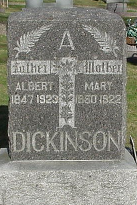 234. Mary Elizabeth PURDY (`) (~) was born on 4 September 1849 in Royalton Township, Niagara County, NY.32,37,73,79,116 (The Greenfield Cemetery gravestone list has her birth year as 1850.) She appeared in the census in 1860 in Greenfield Township, Monroe County, WI.79 She appeared in the census in 1900 in Tomah, Tomah Township, Monroe County, WI.125 Mary died pulmonary tuberculosis on 1 May 1922 at the age of 72 in Tomah, Tomah Township, Monroe County, WI.37,73,116,161,162 She was buried on 4 May 1922 in Tunnel City, Greenfield Township, Monroe County, WI.127,162 in the Greenfield Cemetery. Mary Elizabeth PURDY (`) (~) and Albert A. DICKINSON were married on 18 May 1871 in Monroe County, WI.73,122,163,164,165 Albert A. DICKINSON, son of Hubbard Nelson DICKINSON and Martha BACON, was born on 7 April 1847 in New York.70,73,125,157,165,166 His birth parents were probably Martha and her first husband, surname Bacon. After her first husband died, Martha married Hubbard Dickinson and apparently Hubbard adopted Albert and he was given the surname Dickinson. (The 1880 Census record listed his age as 32, indicating that he was born in 1847, with a birth place of New York. The 1900 Census record for his daughter Eva indicated that he was born in Wisconsin. The 1910 Census listed his age as 63 and his birth place as New York.) About 1879 he was a farmer in Greenfield Township, Monroe County, WI.70,167 He owned a 140-acre farm in the east portion of Section 4. He appeared in the census in 1900 in Tomah, Tomah Township, Monroe County, WI.125 Albert appeared in the census in 1910 in Tomah, Tomah Township, Monroe County, WI.157 He died appoplexia on 4 November 1923 at the age of 76 in Tomah, Tomah Township, Monroe County, WI.73,116,162,165,168 (An article in the Monroe County Heritage Book lists the year of his death as 1940, but the Greenfield Township Cemetery gravestone list indicates it as 1923. He was not listed in the 1930 Census in Monroe County, so he may have died in 1923, not 1940.) He was buried on 7 November 1923 in Tunnel City, Greenfield Township, Monroe County, WI.116,127,162,165 in the Greenfield Township Cemetery. CENSUS 1880 Federal June, Greenfield, Monroe Co, Wisconsin DICKINSON, Albert age 32, head of household, Farmer, Born NY, Father born NY, Mother born Mass Mary wife age 30, wife, keep house, Born NY, Father born NY, Mother born NY Ernest, male, age 8, son, Born WI, father and mother born NY Eva, female, age 6, daughter, born WI, father and mother born NY ? female, age 2, born WI (must be Myrtle), father and mother born NY Martha, female, age 63, mother, disabled, born Mass, Father born Mass, Mother born Mass (Albert's Mother) CENSUS 1870 Federal July 12, Greenfield, Monroe Co, Wisconsin 34-34 DICKINSON, Hubbxxx, male, white, age 60, farmer labor, 400-350, born NY Male citizen of US over 21 Martha, female, white, age 55, keep house, born NY Albert, male, white, age 28, farm labor, born NY, Male citizen of US over 21 Mary Elizabeth PURDY (`) (~) and Albert A. DICKINSON had the following children: Mary Elizabeth PURDY (`) (~) and John W. BOVEE were married on 1 December 1868 in Greenfield Township, Monroe County, WI.156 Newspaper Article: "Robbery - On Monday last, D. C. Purdy, of the town of Greenfield, had his desk robbed of $950 in money belonging to the Town. J. W. Bovee, son-in-law of the Treasurer, being a member of the family, had access to all parts of the house, stole the money and left for parts unknown. It is supposed he took the train east from La Fayette, as the conductor says a man got on at La Fayette and paid his fare to Watertown. $100 reward is offered for the recovery of the money. February 27, 1869 [Saturday] Tomah Journal p. 4 col. 1 Newspaper Article: "$1,000 reward. The above reward will be give for the capture of the thief, J. W. Bovee and the recovery of $950 money stolen from the Town of Greenfield, or $100 will be give for the recovery of the money. His age is about 35 years; 5 feet 10 inches; a little stooped shouldered; sandy hair, and quite long sandy whiskers and moustache; light complexion. Weight, about 170 pounds. Had on black dress coat, black pants, soldier's overcoat, cloth cap or hat, bound with fur, fur collar and cat-skin gloves with muskrat gauntlets. Was last seen at Lafayette Station on Mil. And St. Paul R. R., on train going East, at 8 1-2 P.M., Feb. 22d, 1869. Address, D. C. Purdy, Greenfield, Wis. Or the Sheriff Monroe Co., Wis. Feb. 23d, 1869"