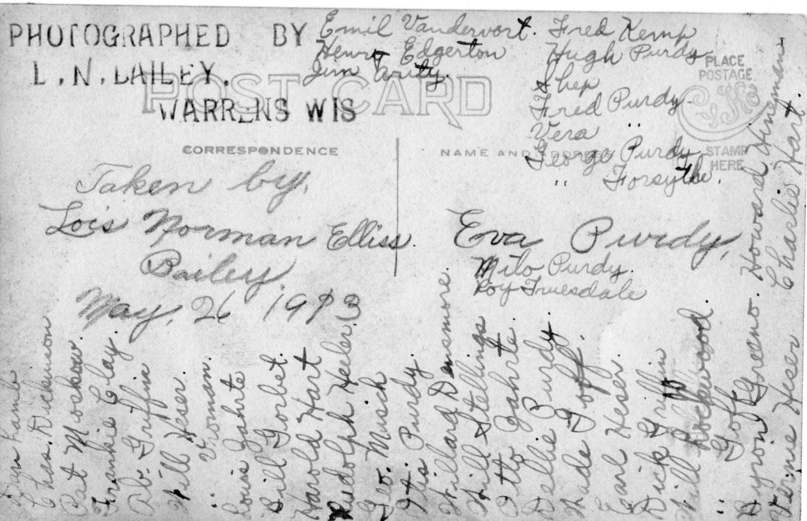 | Home Surname List Name Index Sources | Eleventh Generation467. (This is the back of the picture of the Fred Purdy barn raising in 1913.) She appeared in the census in 1910 in Grant Township, Monroe County, WI.157 She appeared in the census in 1920 in Grant Township, Monroe County, WI.170 Eva graduated in 1921 in Tomah, Tomah Township, Monroe County, WI.431 from Tomah High School. She appeared in the census in 1930 in Grant Township, Monroe County, WI.171 She died on 7 July 1991 at the age of 90 in Tomah, Tomah Township, Monroe County, WI.37,174,361,432 Eva was buried in Tomah, Tomah Township, Monroe County, WI.189 in the Oak Grove Cemetery. Eva Alvera PURDY (~) and Willard Azor DENSMORE were married on 14 September 1927 in Tomah, Tomah Township, Monroe County, WI.112,174,361,433 Eva Alvera PURDY (~) and Rufus Albert HACKETT were married on 25 July 1986 in Sparta, Sparta Township, Monroe County, WI.174 Rufus Albert HACKETT, son of George Alvin "Al" HACKETT and Amanda Jane PRESCOTT, was born on 16 March 1906 in La Grange Township, Monroe County, WI.174,215,434,435 He graduated in 1924 in Tomah, Tomah Township, Monroe County, WI.435 from Tomah High School. He died on 11 January 1989 at the age of 82 in Sparta, Sparta Township, Monroe County, WI.174 |