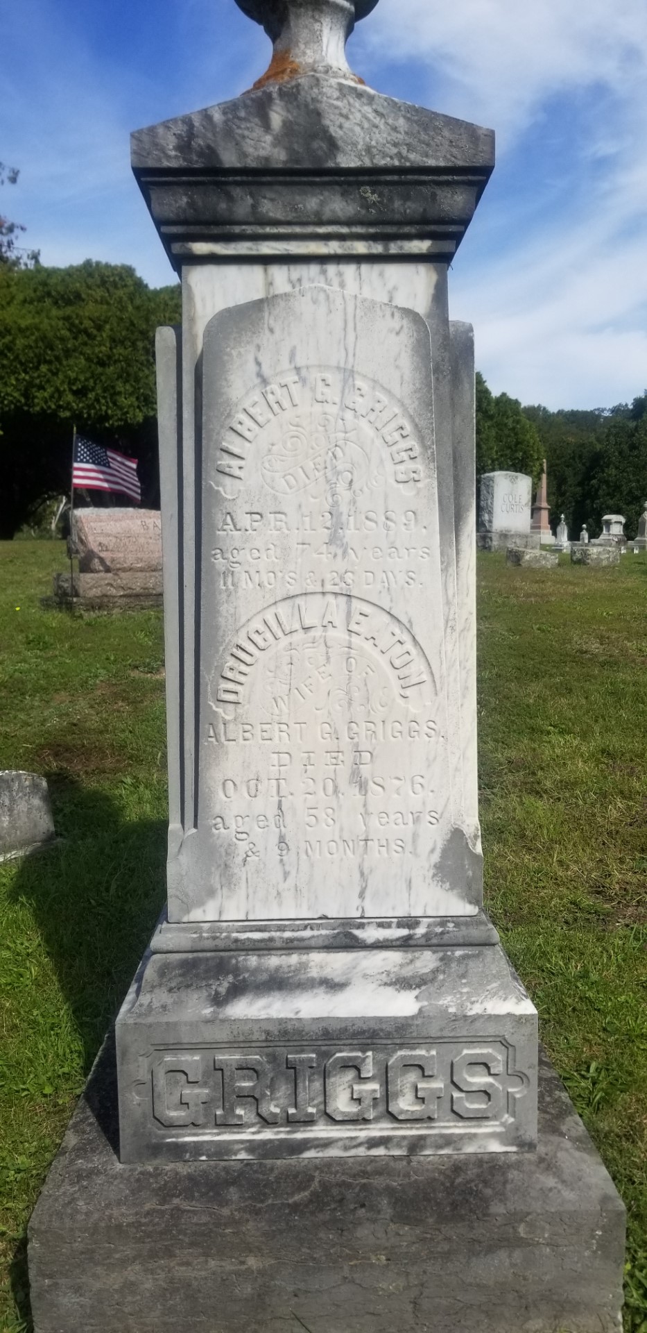 217. Albert Gurley GRIGGS was born on 17 April 1814 in Springfield Township, Otsego County, NY.40,97 He appeared in the census in 1850 in Springfield Township, Otsego County, NY.90 He and his wife were living with his father. His occupation was "Farmer." He died on 12 April 1889 at the age of 74.97,148,149 Albert was buried in Springfield Center, Springfield Township, Otsego County, NY.150 in the Springfield Cemetery. He was buried in Springfield Center, Springfield Township, Otsego County, NY.82 Albert Gurley GRIGGS and Drucilla EATON were married on 29 December 1838.148 Drucilla EATON82 was born on 21 January 1818.148 She appeared in the census in 1850 in Springfield Township, Otsego County, NY.90 She died on 20 October 1876 at the age of 58.148 Drucilla was buried in Springfield Center, Springfield Township, Otsego County, NY.82 in the Springfield Cemetery. Albert Gurley GRIGGS and Drucilla EATON had the following children: +302 | i. | James Anson GRIGGS. | 303 | ii. | David Calvin GRIGGS was born on 1 May 1845 in Springfield Township, Otsego County, NY.92,148 He died on 15 October 1846 at the age of 1 in Springfield Township, Otsego County, NY.92,148 He was buried in Springfield Township, Otsego County, NY.92,94 in the Middle Village Cemetery. | 304 | iii. | John Albert GRIGGS was born on 10 April 1848.148 He appeared in the census in 1850 in Springfield Township, Otsego County, NY.90 (He was listed as Anson.) He died on 29 September 1912 at the age of 64.127 John was buried in Springfield Center, Springfield Township, Otsego County, NY.150 in the Springfield Cemetery. | 305 | iv. | Elmina Drucilla GRIGGS was born on 10 April 1848 in Springfield Township, Otsego County, NY.92,148 She died on 25 August 1850 at the age of 2 in Springfield Township, Otsego County, NY.92,148 She was buried in Springfield Township, Otsego County, NY.94 in the Middle Village Cemetery. | +306 | v. | Louisa Frances GRIGGS. |