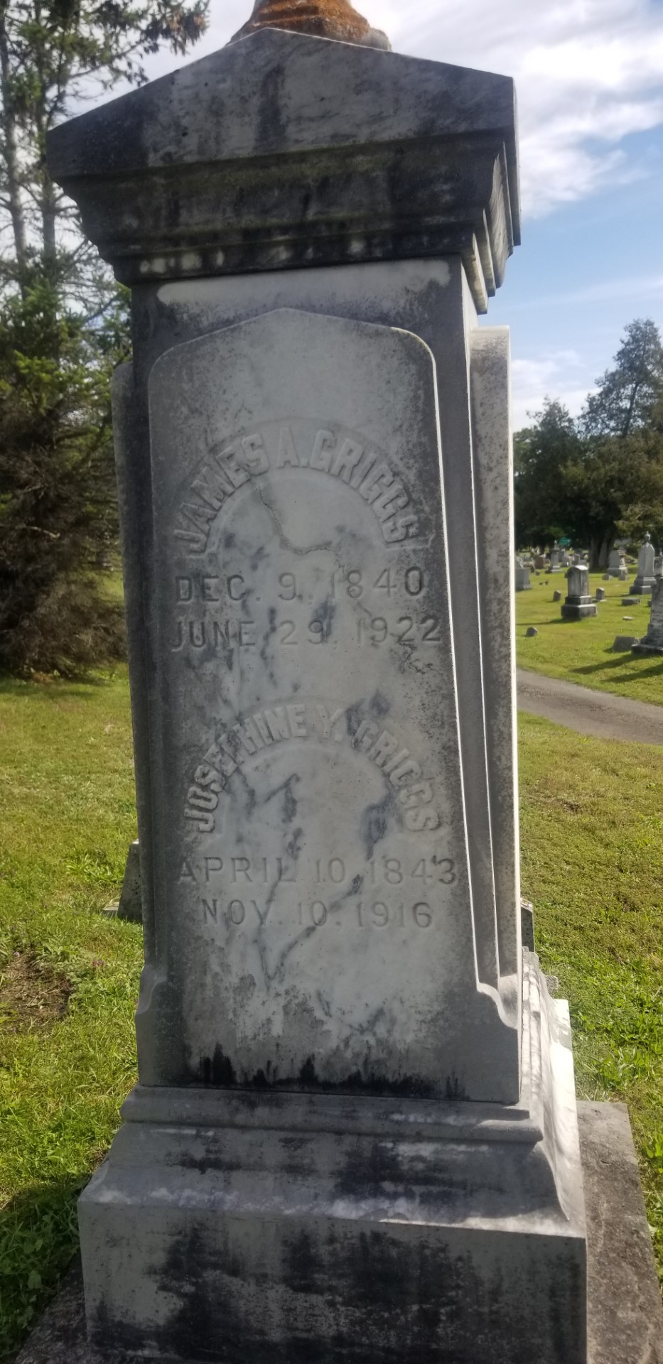 302. James Anson GRIGGS was born on 9 December 1840 in Springfield Township, Otsego County, NY.148 (His middle name may have been "Aaron.") He appeared in the census in 1850 in Springfield Township, Otsego County, NY.90 (He was listed as Albert.) He died on 29 June 1922 at the age of 81 in Cooperstown, Otsego Township, Otsego County, NY.148 James was buried in Springfield Center, Springfield Township, Otsego County, NY.150 in the Springfield Cemetery. James Anson GRIGGS and Josephine YOUNG were married on 23 October 1872.148 Josephine YOUNG was born on 10 April 1843.148 She died on 10 November 1916 at the age of 73 in Cooperstown, Otsego Township, Otsego County, NY.148 James Anson GRIGGS and Josephine YOUNG had the following children: |