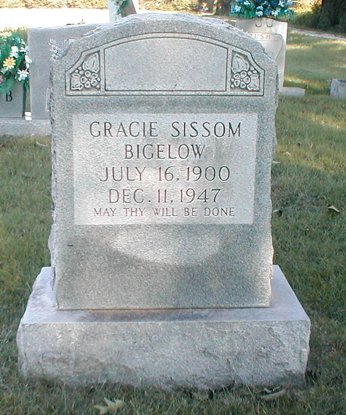 | Home Surname List Name Index Sources | Tenth Generation418. The Monroe County Birth Registration record originally listed his name as "Frederic Raymond," but that name was crossed out, and it was changed to "Willard Lucious." His middle name is spelled "Lucious" on his gravestone marker, and it is not known why it was not spelled the same as his mother's father, Lucius S. Griggs. It may have been an unintentional misspelling on the Birth Registration record. He appeared in the census in 1900 in La Grange Township, Monroe County, WI.168 He lived in Warren County, TN about 1909.251 Will appeared in the census in 1910 in Midland, Midland County, TX.242 He was living with his father and step-mother and was listed as "William," age 11, born in Wisconsin. He lived in Burkburnett, Wichita County, TX about 1915.251 From a letter written by Willie "Bea" Gotcher, the wife of Robert Paul Bigelow, Sr., a son of Minnie's husband, Osmon, in his second marriage: "Grandpa (George) Bigelow, Osmon, Willard, who was then 17, Raymond, Flo Jean & Paul came to Burkburnett to work in oil fields." He appeared in the census in March 1920 in Wichita County, TX.255 He was living with his widowed father and his occupation was "Fireman, Texas Co." (His name was listed as "William D.") Will lived at his home in Hutchinson County, TX in June 1927.397 He appeared in the census in April 1930 in Newport, Campbell County, KY.402 His household was on Orchard Street in the 5th Ward and consisted of Willard; his wife, Grace; their daughter Wilma, and his nephew Raymond, age 22, born in Tennessee. Raymond was the oldest son of Willard's deceased brother, Osmon. Willard's occupation was "Mechanic, Hardware." Also living in his household was Gilford Groves, age 23, a "Boarder." He lived at his home in Newport, Campbell County, KY in September 1938.263 Will appeared in the census in 1940 in Newport, Campbell County, KY.426 His household was at 926 Orchard Street and his occupation was "Welder, Auto." His total wages in 1939 were $1,050. He appeared in the census in 1950 in Fort Thomas, Campbell County, KY.427 He died on 6 February 1969 at the age of 70 in Fort Thomas, Campbell County, KY.102,181,245,428 (SS No. 270-01-2802) (He may have died in Coffee County, TN.) Will was buried in Coffee County, TN.245,429 in the Hopewell Cemetery. Willard Lucious "Will" BIGELOW (~) and Gracie Hall SISSOM were married on 10 July 1920 in Murfreesboro, Rutherford County, TN.245,263,289,402,429,430 Willard Lucious "Will" BIGELOW (~) and Gracie Hall SISSOM had the following children: