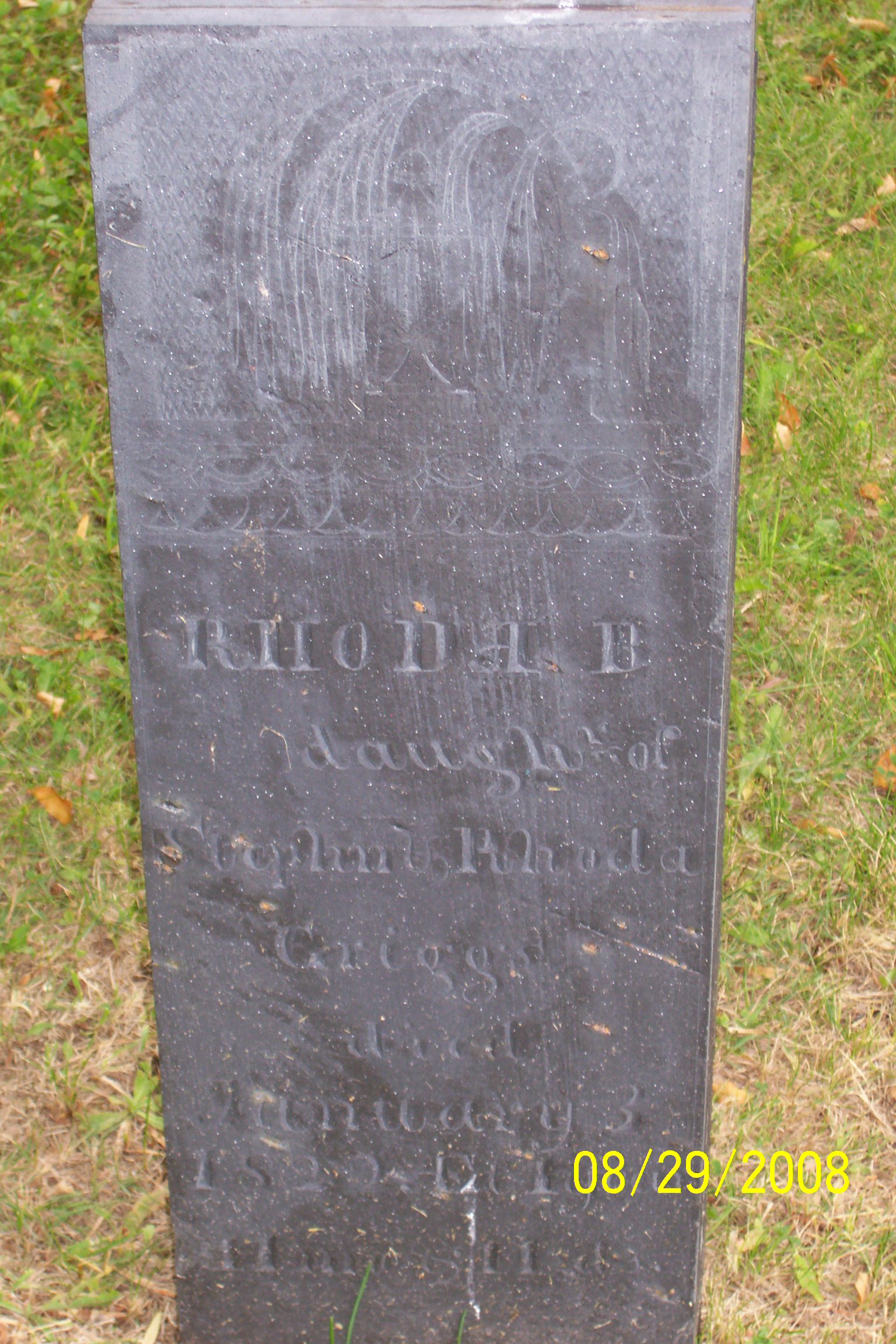 317. Rhoda Bacon SMITH (*) was born on 4 June 1786 in Pomfret Township, Windham County, Connecticut Colony, British Colonial America.27,55,56,63 (An LDS Family Group Record on www.FamilySearch.org lists her birth place as Woodstock, Windsor County, VT.) (Connecticut became the 5th State of the Union on January 9, 1788, so it was still a British Colony when she was born.) She appeared in the census in 1790 in Pomfret Township, Windham County, CT.53 She appeared in the census in 1810 in Fayston Township, Chittenden County, VT.63,82 Rhoda appeared in the census in 1820 in Fayston Township, Washington County, VT.83 She lived in Fayston Township, Washington County, VT after March 1828.84,85,86,87 After her husband died, she lived at the home of her son, John Chandler, and his family. She appeared in the census in 1830 in Fayston Township, Washington County, VT.84 She was living with her son John Chandler and his family. Rhoda appeared in the census in 1840 in Fayston Township, Washington County, VT.85 She was living with her son John Chandler and his family. She appeared in the census in 1850 in Fayston Township, Washington County, VT.86 She was living with her son John Chandler and his family and was listed as "Rhody." She appeared in the census in 1860 in Fayston Township, Washington County, VT.87 She was living with her son John Chandler and his family. Her occupation was "Domestic." Rhoda died on 30 July 1861 at the age of 75 in Fayston Township, Washington County, VT.55,63,88 She was buried in Irasville, Waitsfield Township, Washington County, VT.88 in the Irasville Cemetery. Gravestone Inscription: "Rhoda B. relict of Stephen Griggs, Died July 30, 1861 AE 75 yrs" ("Relict" means "surviving the death of another" and "AE" was the common gravestone symbol for "age.") (It is not known why she was not buried with her husband and daughter Rhoda, 1820-1822, in the South Fayston Cemetery on Bragg Hill, near their home on Griggs Road. She is buried with several of her other family members in the Irasville Cemetery, about five miles to the north.) Rhoda Bacon SMITH (*) and Stephen Chandler GRIGGS (*) were married on 8 March 1807 in Pomfret Township, Windham County, CT.55,63,64,89 Article in the "Fayston Centennial Celebration": "Stephen Griggs was the third (grand)son of a Revolutionary War Soldier, Solomon Griggs, Sr., Englishman. His wife, Rhoda Bacon Smith, was the oldest daughter of the veritable John Smith, from England, linen weaver. They came from Pomfret, Conn., to Fayston in 1809, and their history is similar to that of many an ambitious, hardy pioneer in those early times. Mr. Griggs first started on foot to prospect for a desirable location on government land in New York. At a tavern where he stopped for a night, a man returning from Vermont gave such marvelous account of the fertility of the soil, the purity of the air, and the abundance of water--brooks full of trout--that Mr. Griggs changed his course and came here. He bought 80 acres where Howland Russell now lives, and soon had a clearing, a log house and a small barn. He moved his family and all his household goods on an ox sled, and bought one cow soon after his arrival. He raised corn, flax and wheat, made maple syrup from sap caught in troughs of his own hewing, set out apple trees, helped build roads and bridges, and was ever ready for every good work. The toils and privations of pioneer life were bravely met by them, as by others all around. After the memorable cold year of 1816, before grain was harvested the next year, Mrs. Griggs said that for six weeks she did not taste bread. Their 'staff of life' was potatoes, eggs, milk and abundant berries. They had eight children. At the early age of 44 years, Mr. Griggs died, leaving the care of his family to his widow and oldest son, J. C. Griggs, who nobly filled the trust." Stephen Chandler GRIGGS (*), son of Stephen GRIGGS and Sarah CHANDLER, was born on 11 October 1784 in Pomfret Township, Windham County, Connecticut Colony, British Colonial America.38,55,63,90,91,92,93,94,95,96,97 His middle name was his mother's maiden name. His given name was spelled "Steven" on the marriage record of his son, Lucius S., but it is spelled "Stephen" on his gravestone and on that of his daughter Rhoda. His birthdate is listed as 17 Nov 1784 in the "North America, Family Histories, 1500-2000" page 205; that is believed to be an error. Connecticut became the 5th Colony to join the United States on January 9, 1788, so it was still a British Colony when he was born. He appeared in the census in 1790 in Pomfret Township, Windham County, CT.53,92 He appeared in the census in 1800 in Pomfret Township, Windham County, CT.65 Stephen lived at his home in Pomfret Township, Windham County, CT in 1809.55,63,64,92 They moved from Pomfret Township, CT to Vermont in mid-1809. They were early settlers of Waitsfield Township in Chittenden County, VT. They eventually moved to a farm on Griggs Road near Number Nine Road on Bragg Hill, northwest of Irasville in Fayston Township. (In 1810, Waitsfield Township became part of Jefferson County, which was renamed Washington County in 1814.) He appeared in the census in 1810 in Fayston Township, Chittenden County, VT.92,98 His household consisted of one male, age 16-25 (Stephen); one female, age 16-25 (his wife, Rhoda); one male, age under 10 (their son, John Chandler); and one female, age under 10 (their daughter, Lucinda). He appeared in the census in 1820 in Fayston Township, Washington County, VT.83,92 His household consisted of one male, age 26-45 (Stephen); one female, age 26-45 (his wife, Rhoda); one male, age under 10 (their son Lucius); one male, age 10-16 (their son John Chandler); four females, age under 10 (their daughters Sarah, Susan, Rhoda and an unknown female); one female, age 10-16 (Lucinda); and one female, age 16-26, who may have been the mother of the unknown female (age under 10). Their identity and relationship are not known. Stephen died on 15 M