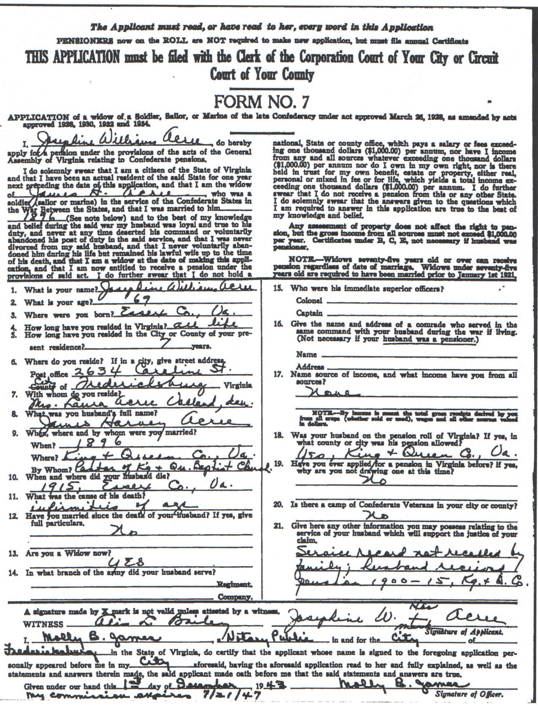 424. James Harvey ACREE (^^) was born on 3 March 1844 in Caroline County, VA.269,271,275 (Attached is the military pension application filed by his second wife, Josephine Williams, in 1943, for him having served in the Confederacy. She listed his year of death as 1915, but it was 1911.). He appeared in the census in 1850 in Caroline County, VA.272 He appeared in the census in 1860 in Sparta, Caroline County, VA.273 His occupation was listed as "Laborer." James appeared in the census in 1870 in Newtown, King and Queen County, VA.440 His occupation was "Works at Grist Mill." He appeared in the census in 1880 in Newtown, King and Queen County, VA.441 His occupation was "Farmer." He appeared in the census in 1900 in Newtown, King and Queen County, VA.442 His occupation was "Farmer." James appeared in the census in 1910 in Central District, Essex County, VA.443 He was listed as "Joseph" and his occupation was "Miller, Grist Mill." He died on 11 September 1911 at the age of 67 in King and Queen County, VA.269,271,275 (The family website of Jackie (Acree) Horst lists his year of death as 1915.) He has Ancestral File Number 5BDV-LR.270 James Harvey ACREE (^^) and Mary Jane TURNER (^^) were married on 27 February 1867 in Caroline County, VA.269,271,442 Mary Jane TURNER (^^), daughter of George H. TURNER and Nancy UNKNOWN (TURNER), was born on 11 September 1843 in Caroline County, VA.269 She appeared in the census in 1860 in Caroline County, VA.444 She appeared in the census in 1870 in Newtown, King and Queen County, VA.440 Mary appeared in the census in 1880 in Newtown, King and Queen County, VA.441 She died on 11 August 1893 at the age of 49 at Garnetts Mill in Owenton, King and Queen County, VA.269 James Harvey ACREE (^^) and Mary Jane TURNER (^^) had the following children: James Harvey ACREE (^^) and Josephine Gertrude WILLIAMS were married on 26 December 1895 in King and Queen County, VA.271,442,446,447,448 at the King and Queen Baptist Church. Josephine Gertrude WILLIAMS446, daughter of Robert WILLIAMS and Elizabeth UNKNOWN (WILLIAMS), was born on 12 October 1879 in Tappahannock, Essex County, VA.38,442,446,448 (Her gravestone lists her birth year as 1879; other records list it as 1874.) She appeared in the census in 1900 in Newtown, King and Queen County, VA.442 She appeared in the census in 1910 in Central District, Essex County, VA.443 Josephine died on 16 February 1944 at the age of 64 in Fredericksburg (Independent City), VA.38,448 Notes: "When Josephine Gertrude Williams was born on October 12, 1874 (sic), in Tappahannock, Virginia, her father, Robert, was 24, and her mother, Elizabeth, was 24. She married James Harvey Acree on December 26, 1895, in King and Queen, Virginia. She died on February 16, 1944, in Spotsylvania, Virginia, at the age of 69, and was buried in Fredericksburg, Virginia." James Harvey ACREE (^^) and Josephine Gertrude WILLIAMS had the following children: 507 | i. | Robert Edward ACREE was born on 5 January 1897 in Virginia.442,444 He appeared in the census in 1900 in Newtown, King and Queen County, VA.442 He appeared in the census in 1910 in Central District, Essex County, VA.443 (He was listed as Edward.) Robert died on 12 January 1978 at the age of 81 in Newport News (Independent City), VA.444 | 508 | ii. | Lucy Ellen ACREE was born on 22 April 1898 in King and Queen County, VA.442,444 She appeared in the census in 1900 in Newtown, King and Queen County, VA.442 She appeared in the census in 1910 in Central District, Essex County, VA.443 Lucy died on 7 May 1973 at the age of 75 in Stafford County, VA.444 | 509 | iii. | Laura Bell ACREE was born on 16 September 1899 in King and Queen County, VA.442,444 She appeared in the census in 1900 in Newtown, King and Queen County, VA.442 She appeared in the census in 1910 in Central District, Essex County, VA.443 Laura died on 23 September 1988 at the age of 89 in Fredericksburg (Independent City), VA.444 | 510 | iv. | Charles Wilbert ACREE was born on 17 August 1902 in Virginia.443,444,449 He appeared in the census in 1910 in Central District, Essex County, VA.443 He died on 1 February 1988 at the age of 85 in Portsmouth (Independent City), VA.444 | 511 | v. | Irving Levi ACREE was born on 25 June 1905 in Virginia.443,444 He appeared in the census in 1910 in Central District, Essex County, VA.443 He died in July 1979 at the age of 74 in Maryland.444 | 512 | vi. | Andrew Jackson ACREE was born on 10 July 1908 in Virginia.443 He appeared in the census in 1910 in Central District, Essex County, VA.443 He died on 4 August 1982 at the age of 74 in Fredericksburg (Independent City), VA.444 Andrew was buried in Fredericksburg (Independent City), VA.449 in the Oak Hill Cemetery. | 513 | vii. | Cora Lee ACREE was born on 30 September 1909 in Richmond (Independent City), VA.443,444,449 She appeared in the census in 1910 in Central District, Essex County, VA.443 She died on 9 April 1988 at the age of 78 in Baltimore (Independent City), MD.444 |